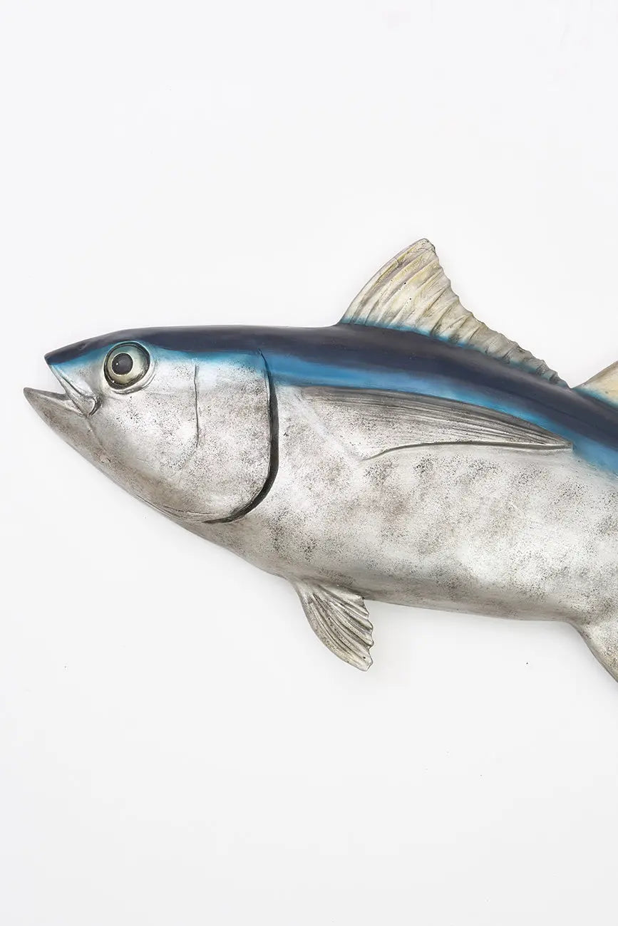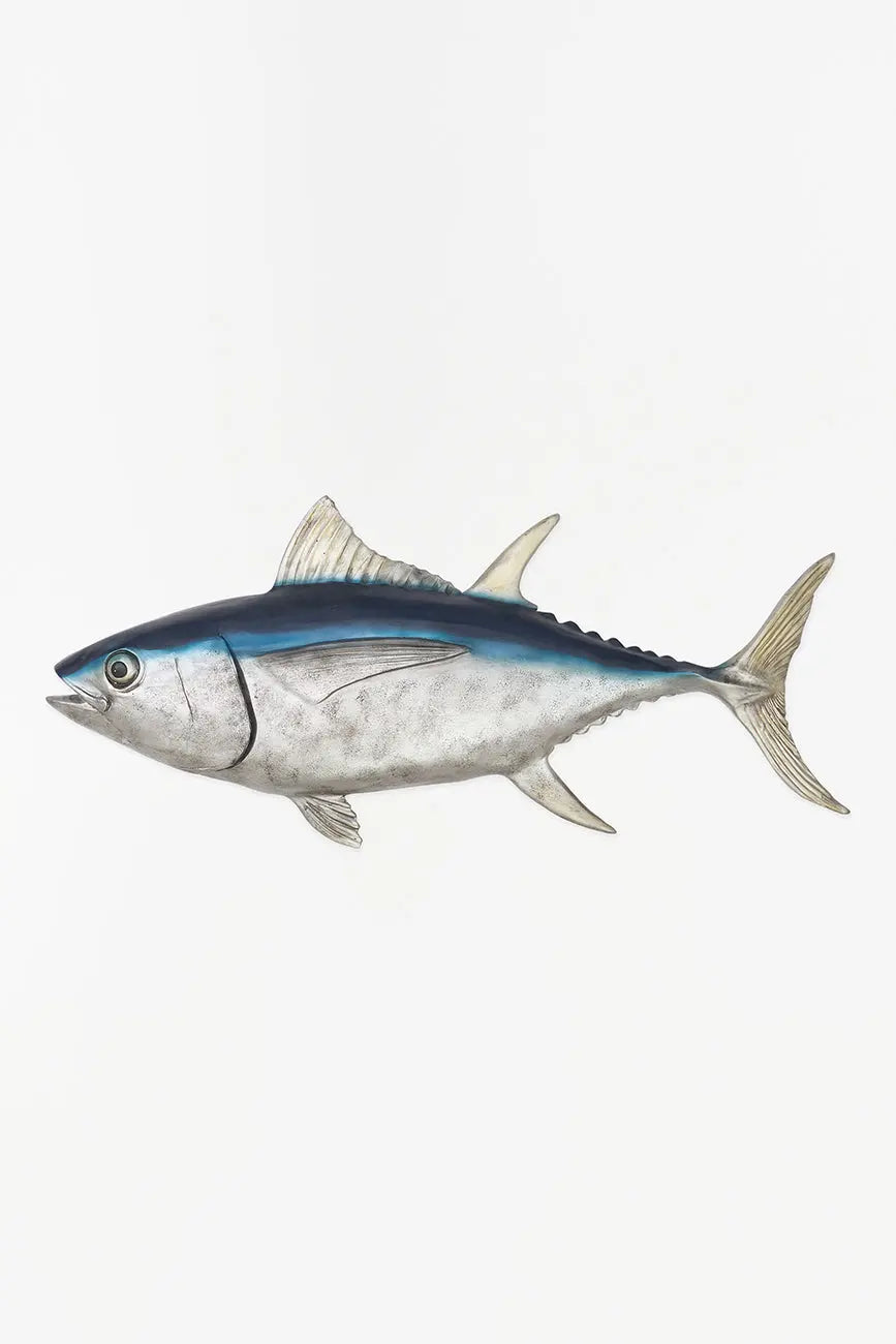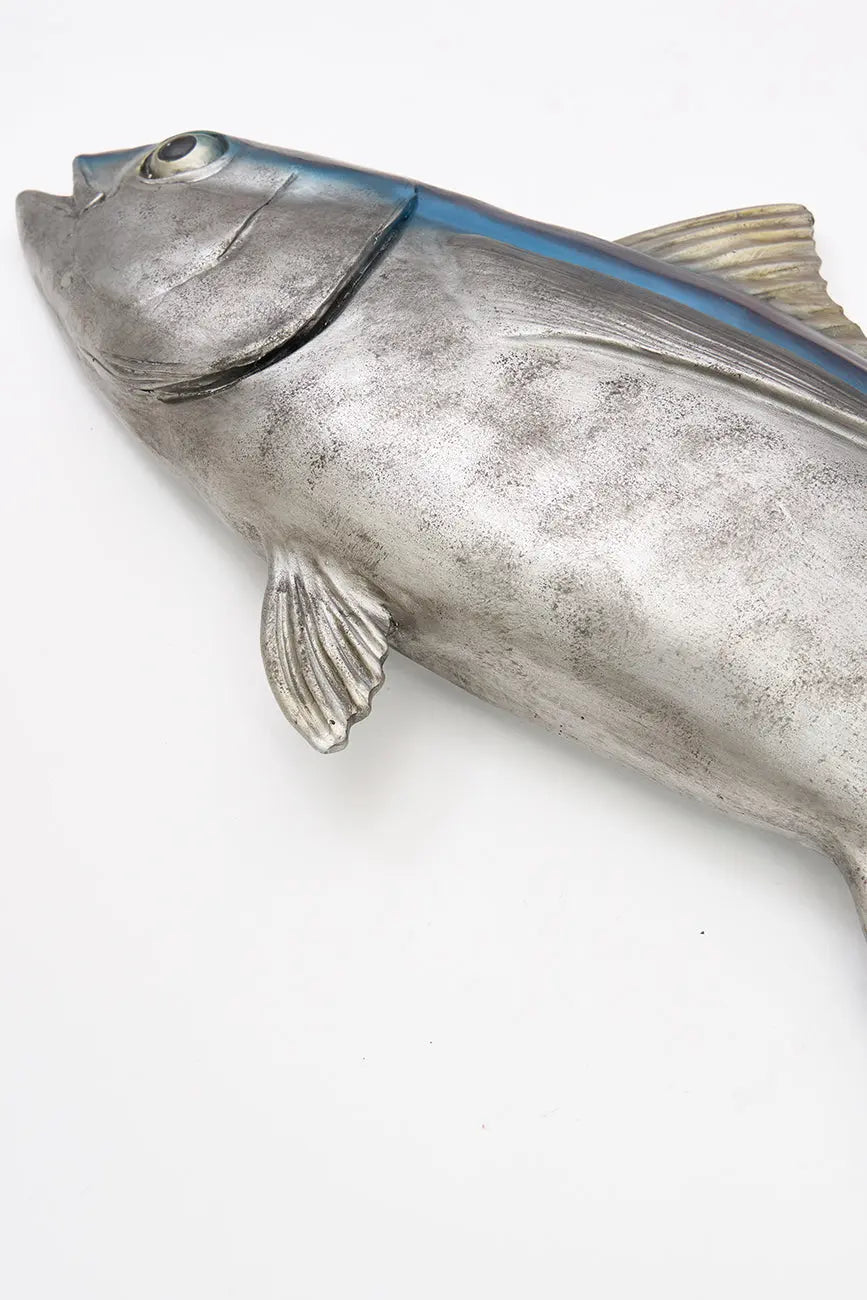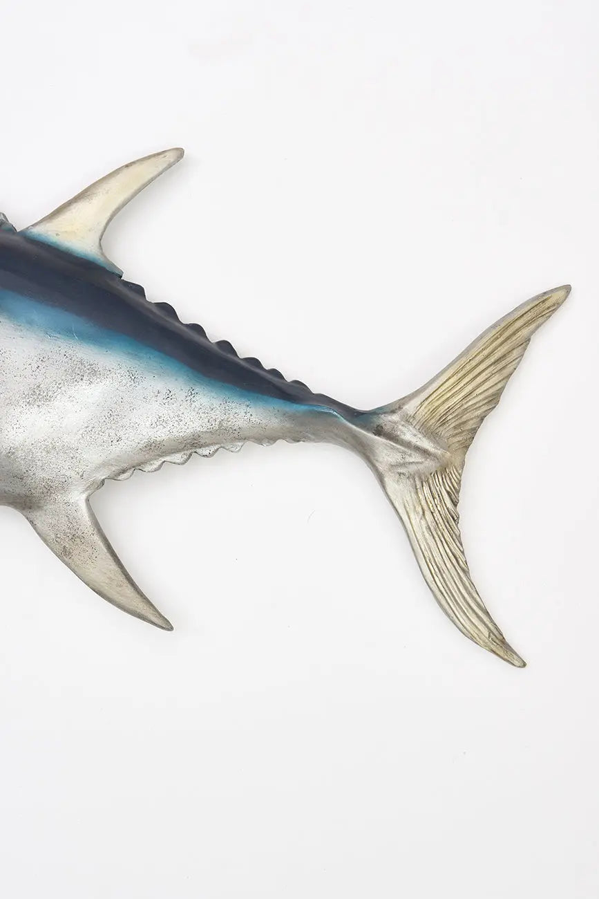 Figura realista de atún hecha en resina para pared. Esta figura de atún, elaborada en resina de alta calidad, destaca por su nivel de detalle y realismo impresionante. Su acabado meticuloso refleja las características naturales del atún, desde su musculatura hasta sus tonos metálicos característicos. Dimensiones: l: 62 cm – w: 4 cm – h: 27 cm.