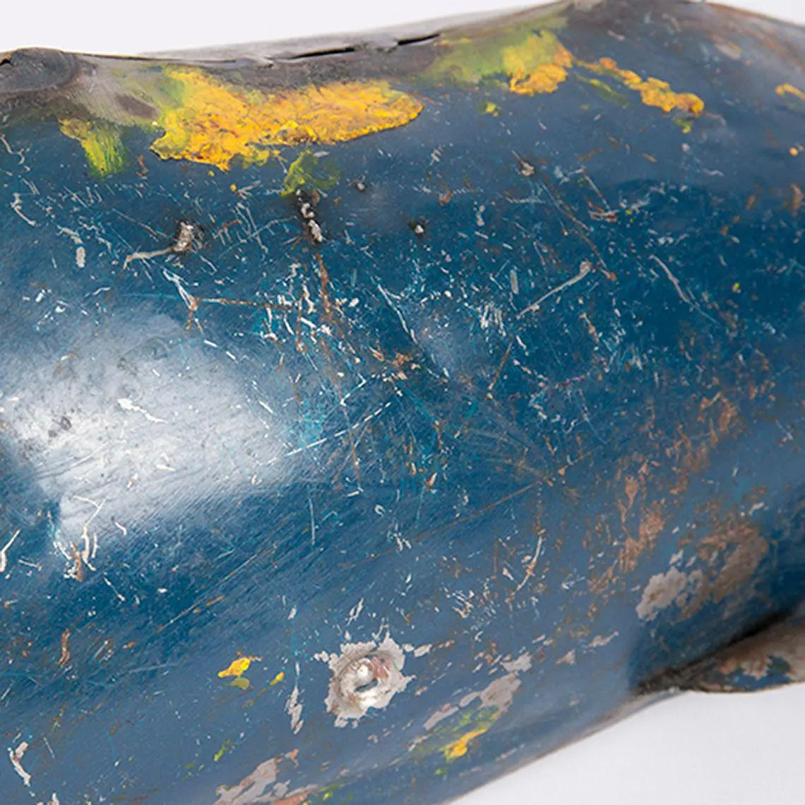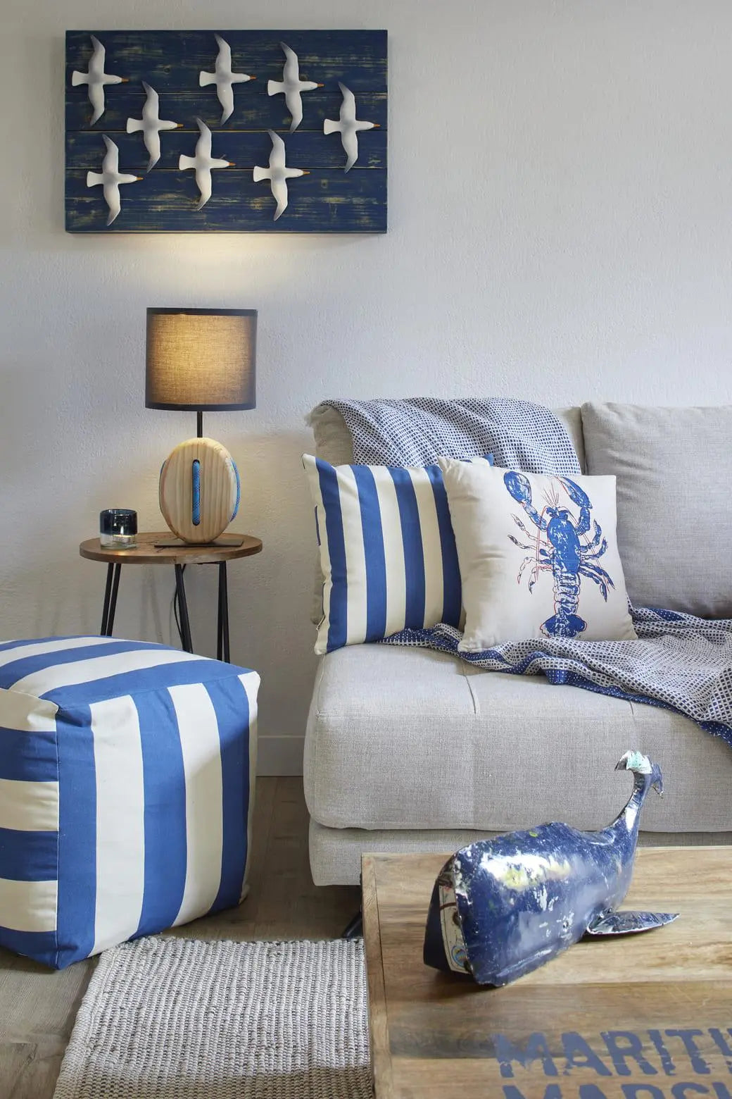 Ballena decorativa náutica azul hecha de metal recuperado de bidones reciclados. Un elemento náutico de decoración diferente para el hogar. Dimensiones: l: 37 cm.