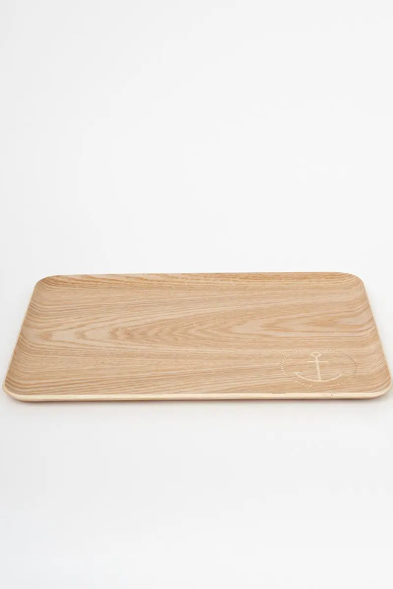 Bandeja de bambú funcional y resistente. Lleva un grabado de un ancla rodeada de un cabo en uno de los extremos. Tamaño más grande de 3. Dimensiones: l: 39,5 cm – w: 27,5 cm – h: 2 cm.