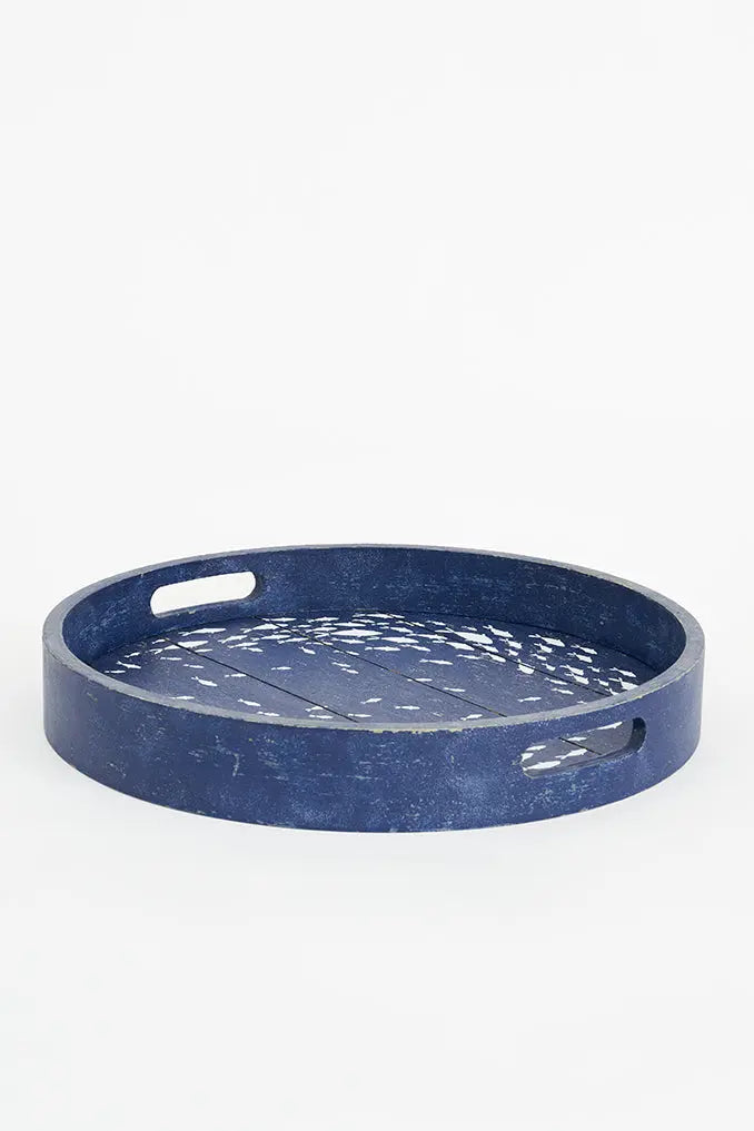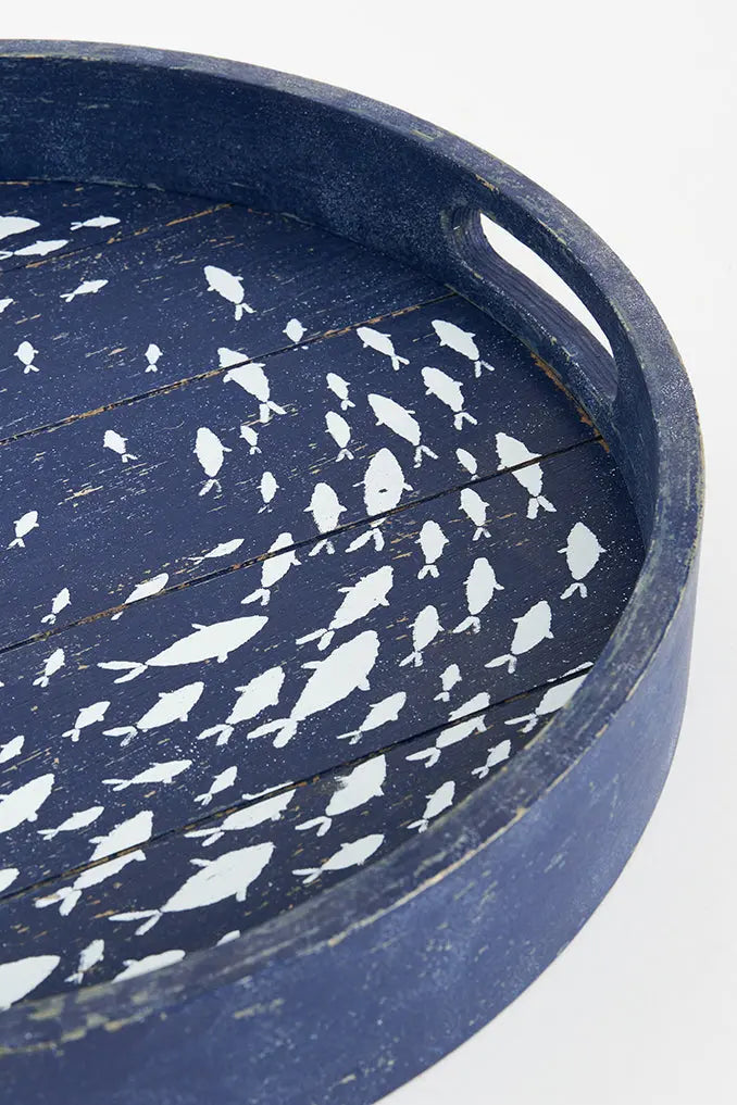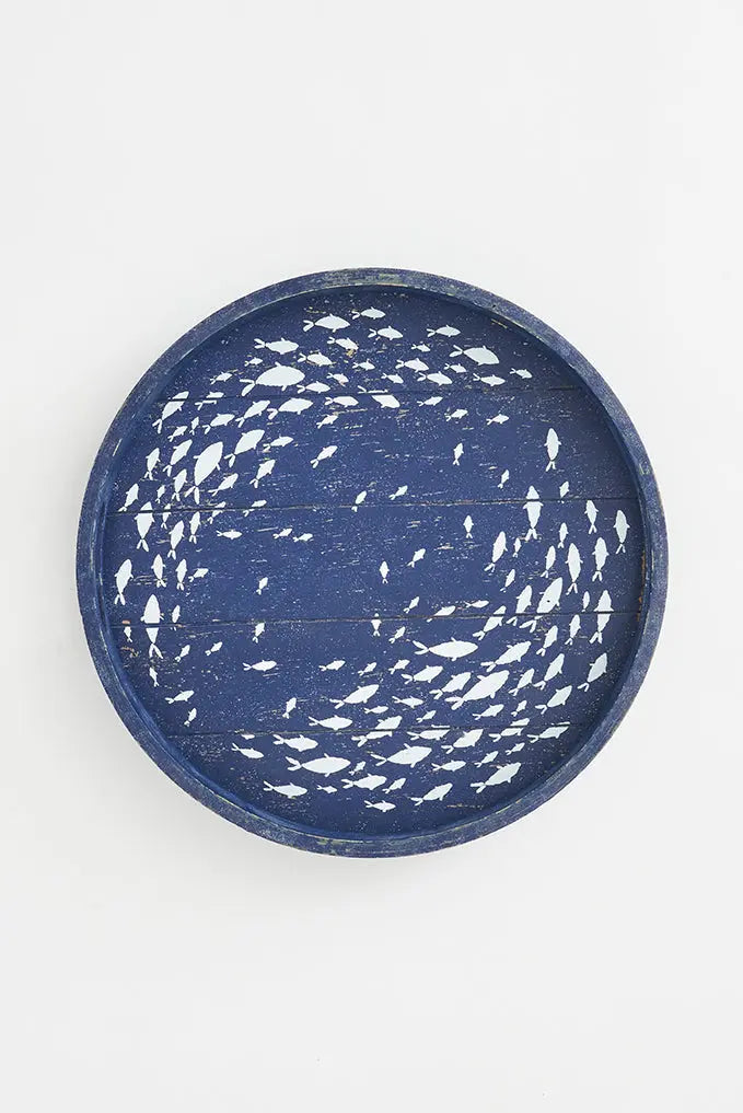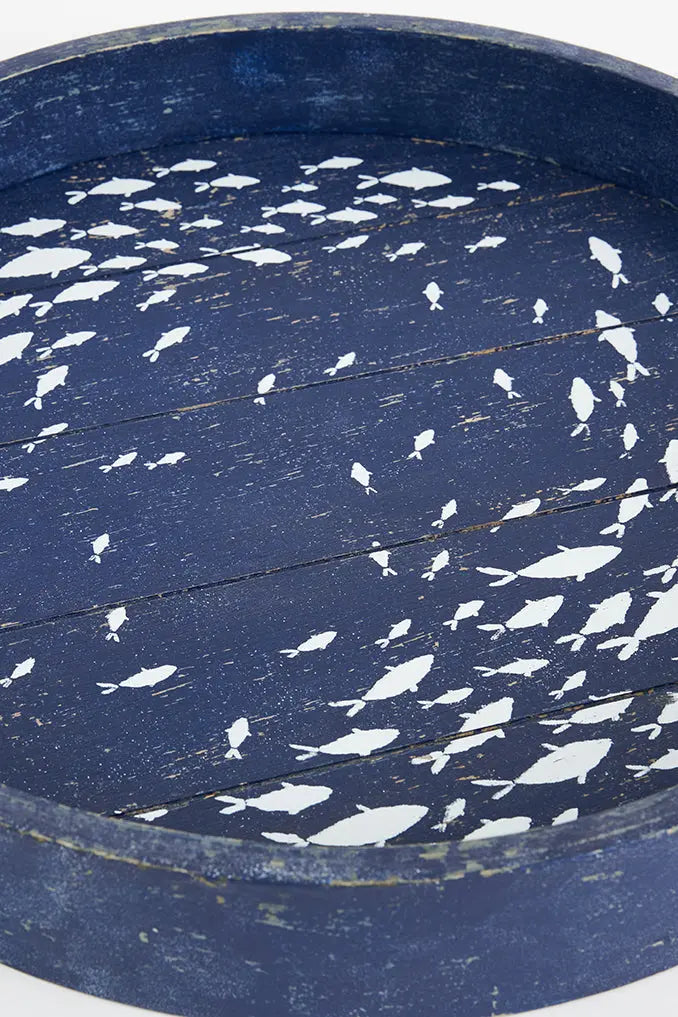 Bandeja de madera redonda azul: elegancia y encanto marino añade un toque de elegancia y encanto marino a tu espacio con nuestra bandeja de madera redonda azul. El diseño en tonos azules y el banco de pequeños peces le confieren un estilo náutico distintivo. Perfecta para servir aperitivos, bebidas o simplemente como elemento decorativo, esta bandeja es versátil y atractiva. Dimensiones: h: 6 cm – ø: 38 cm.