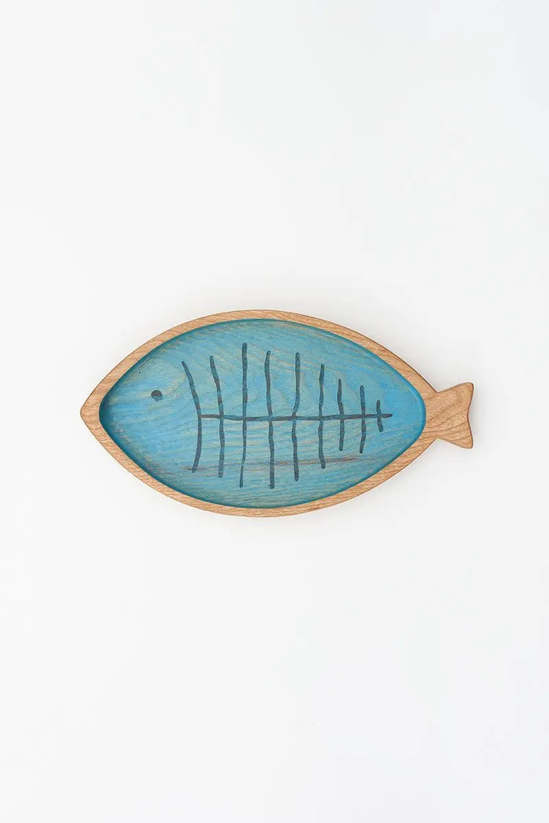 Bandeja de madera con forma de pez y con las espinas grabadas en su interior. El exterior es de madera natural y el interior está pintado en azul. Dimensiones: l: 32 cm – w: 17 cm – h: 3 cm.