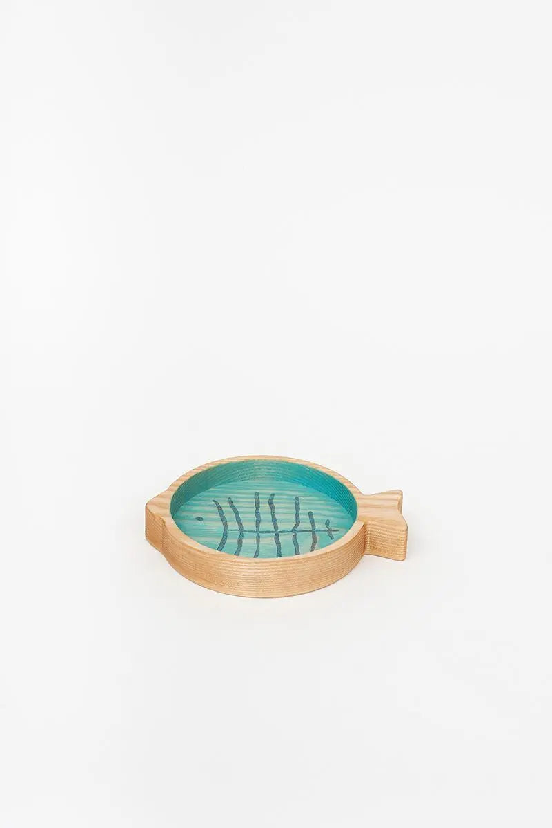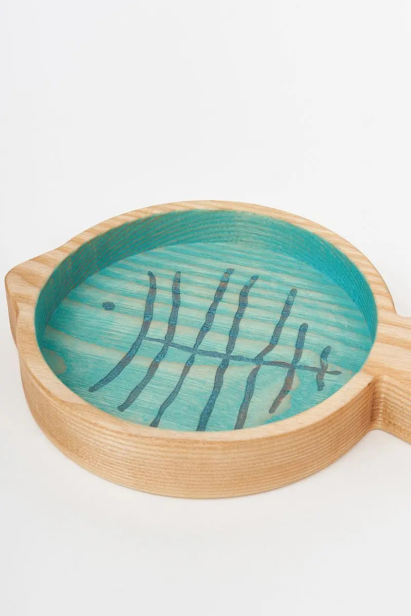 Bandeja de madera con forma de pez y con las espinas grabadas en su interior. El exterior es de madera natural y el interior está pintado en turquesa. Dimensiones: l: 19 cm – w: 15 cm – h: 3 cm.