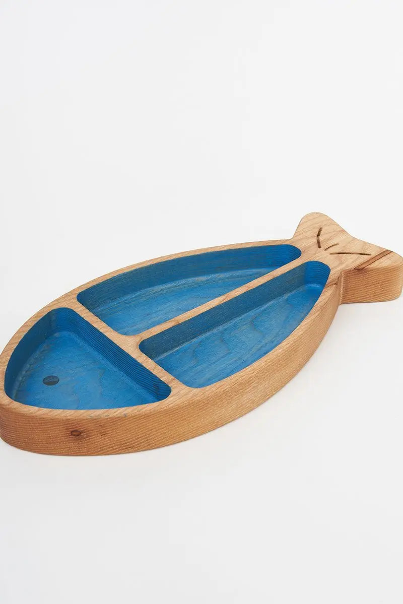 Bandeja de madera con forma de pez con tres compartimientos. El exterior es de madera natural y el interior va pintado en azul. Dimensiones: l: 30 cm – w: 15 cm – h: 3 cm.