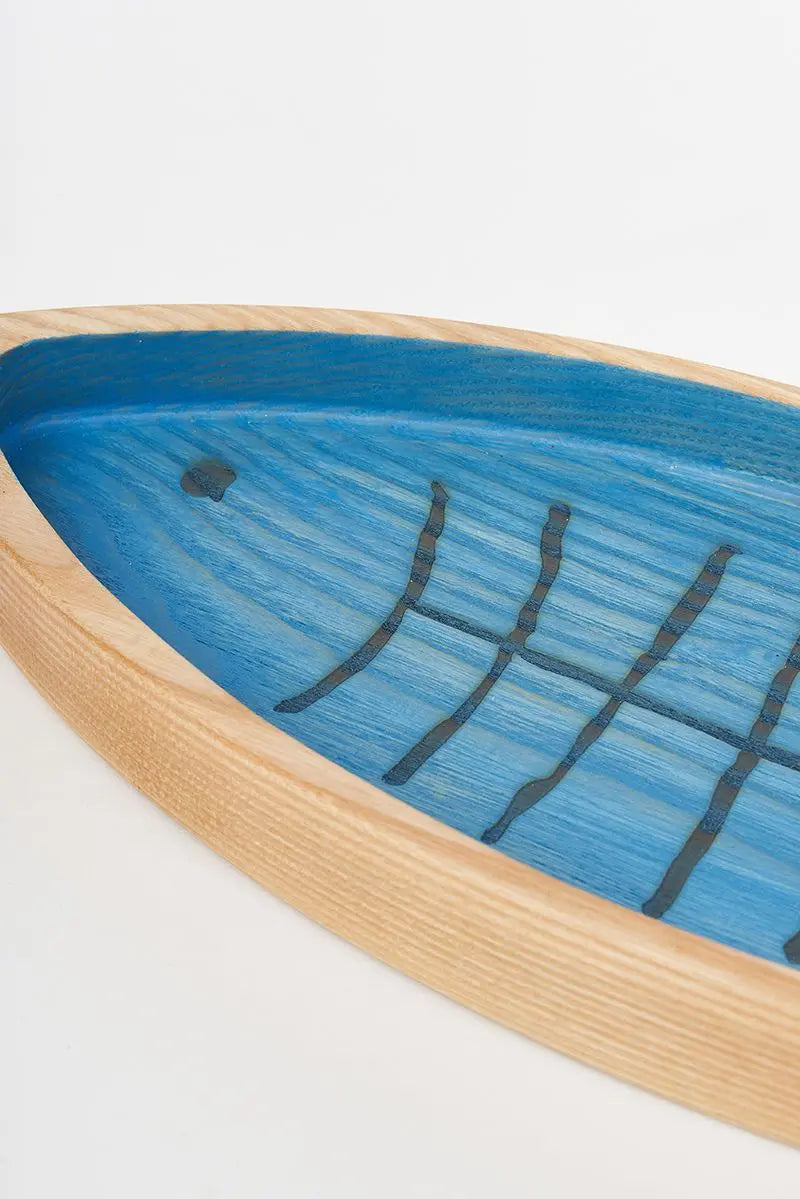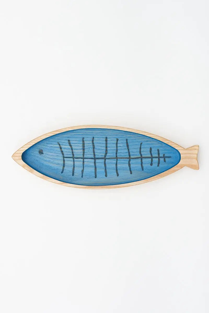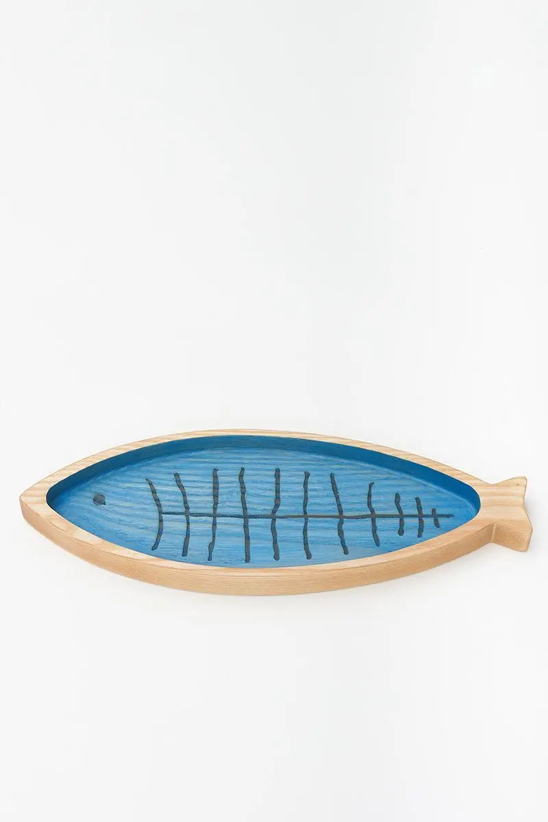 Bandeja de madera con forma de pez y con las espinas grabadas en su interior. El exterior es de madera natural y el interior está pintado en azul. Dimensiones: l: 40 cm – w: 14 cm – h: 3 cm.