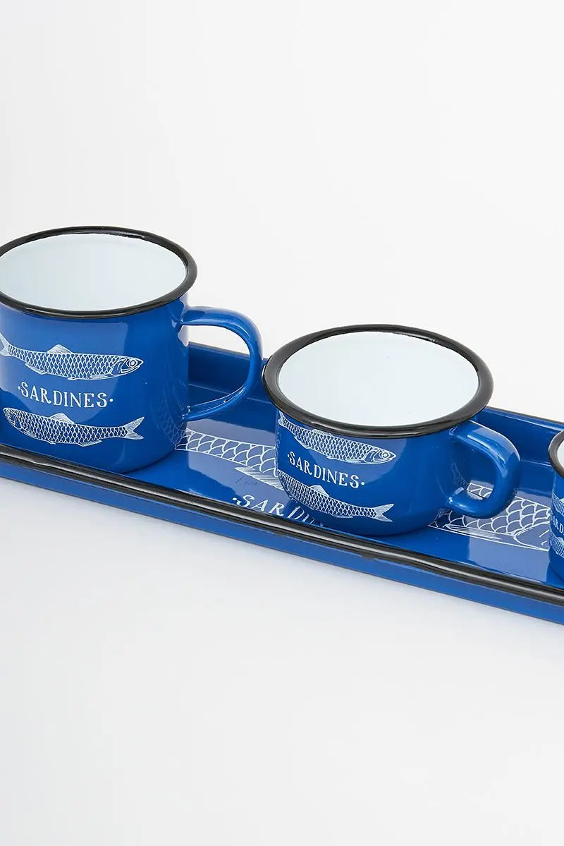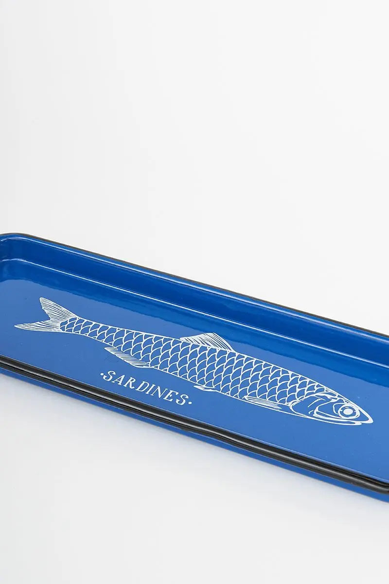 Bandeja de metal esmaltado en color azul. Lleva dos sardinas pintadas en color blanco con el texto ‘sardines’. Dimensiones: l: 35 cm – w: 13 cm – h: 2 cm.