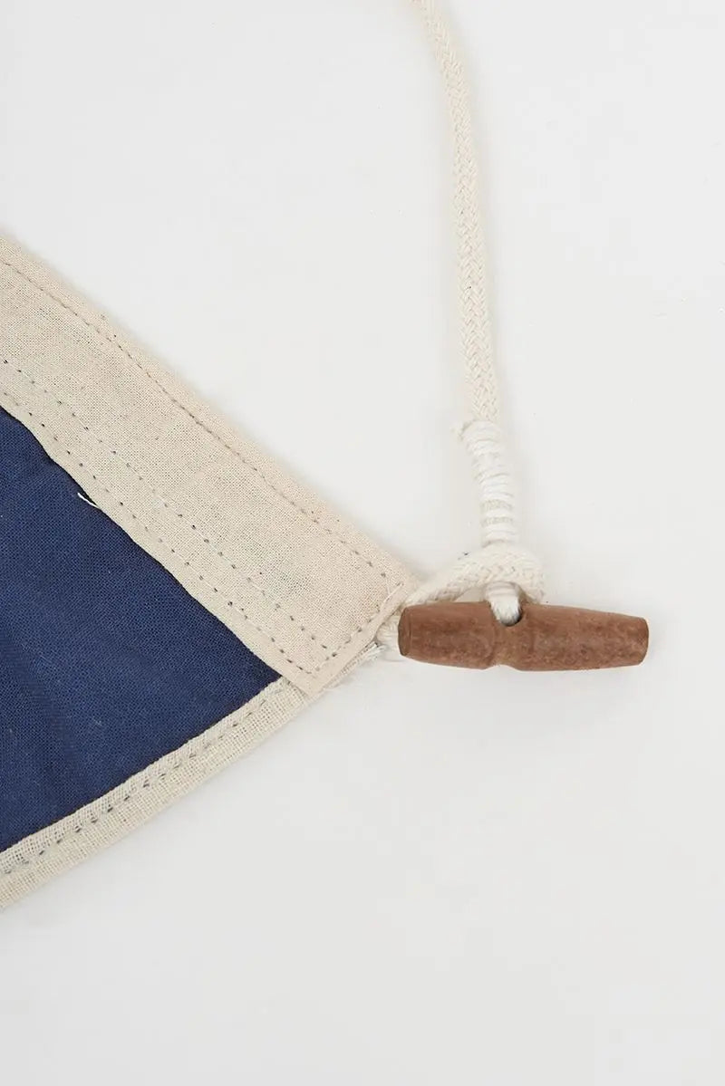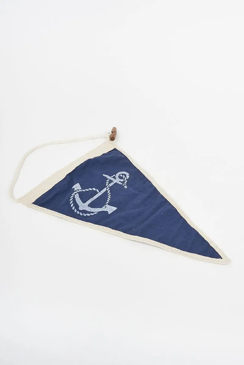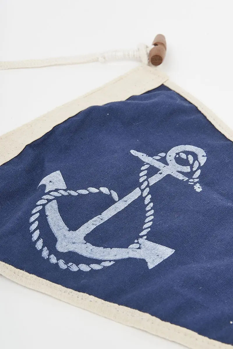 Bandera decorativa vintage azul y blanca con un ancla y detalle de botón en madera. Dimensiones: l: 34 cm – h: 22 cm.