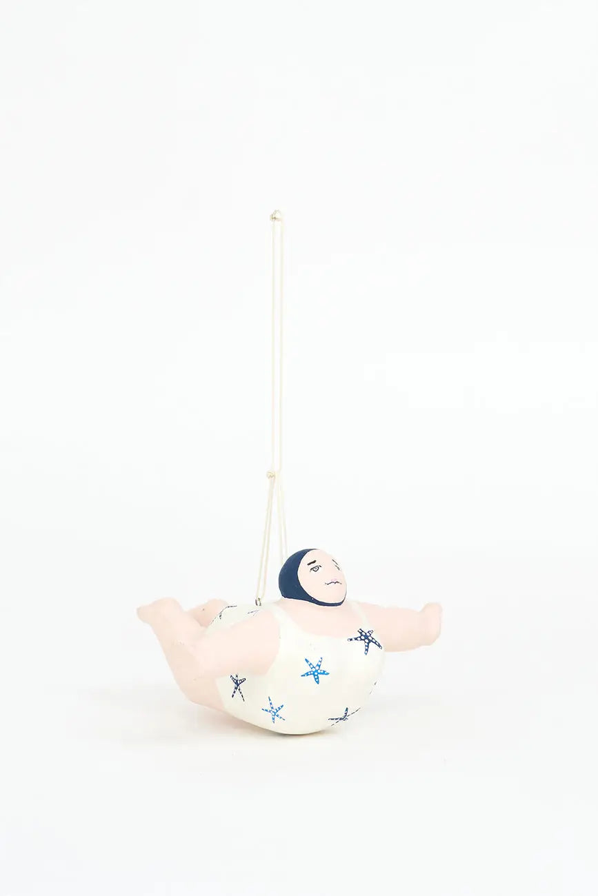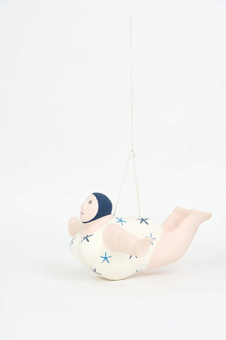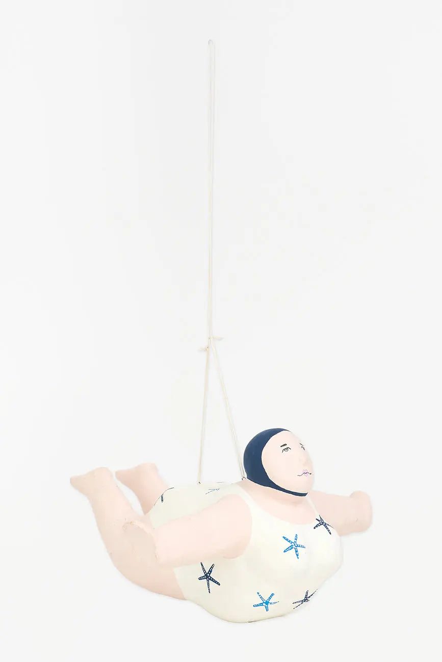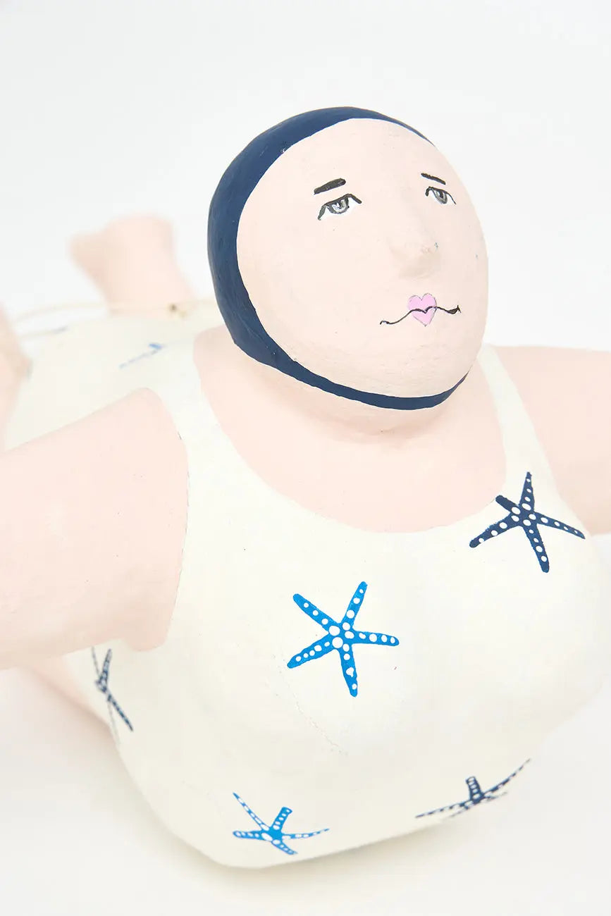 Bañista hecha en papel maché para colgar. Esta encantadora figura de bañista está elaborada en papel maché y diseñada para colgar, aportando un toque divertido y nostálgico a tu decoración. Luce un alegre traje de baño decorado con estrellas de mar, evocando el espíritu relajado y festivo de los días de playa. Su acabado artesanal y sus detalles cuidadosamente pintados le confieren personalidad y calidez. Dimensiones: l: 31 cm – w: 31 cm – h: 20 cm.