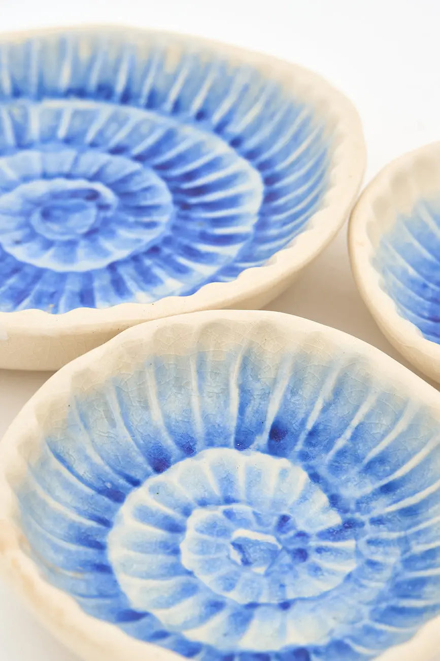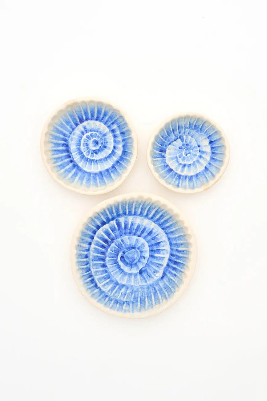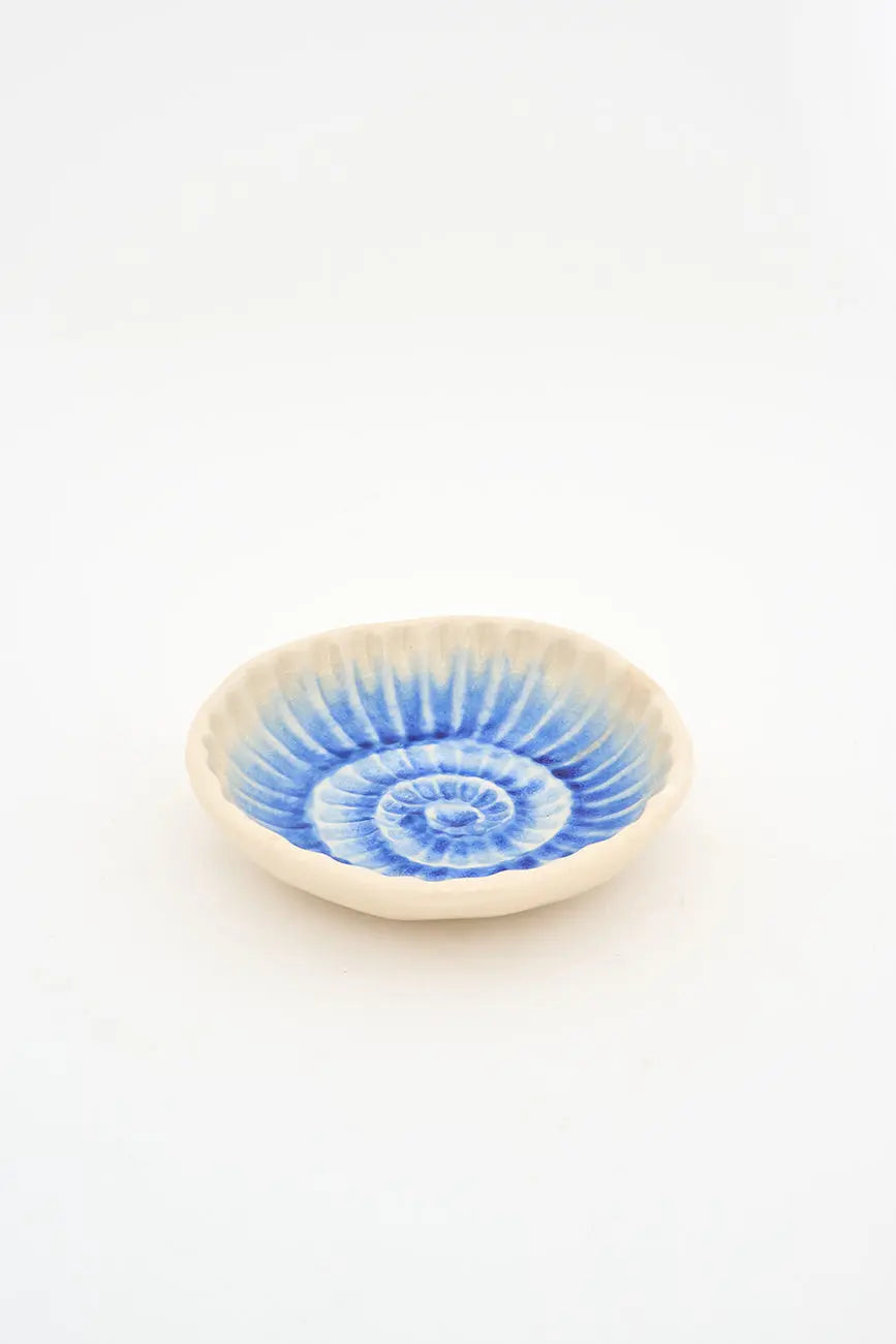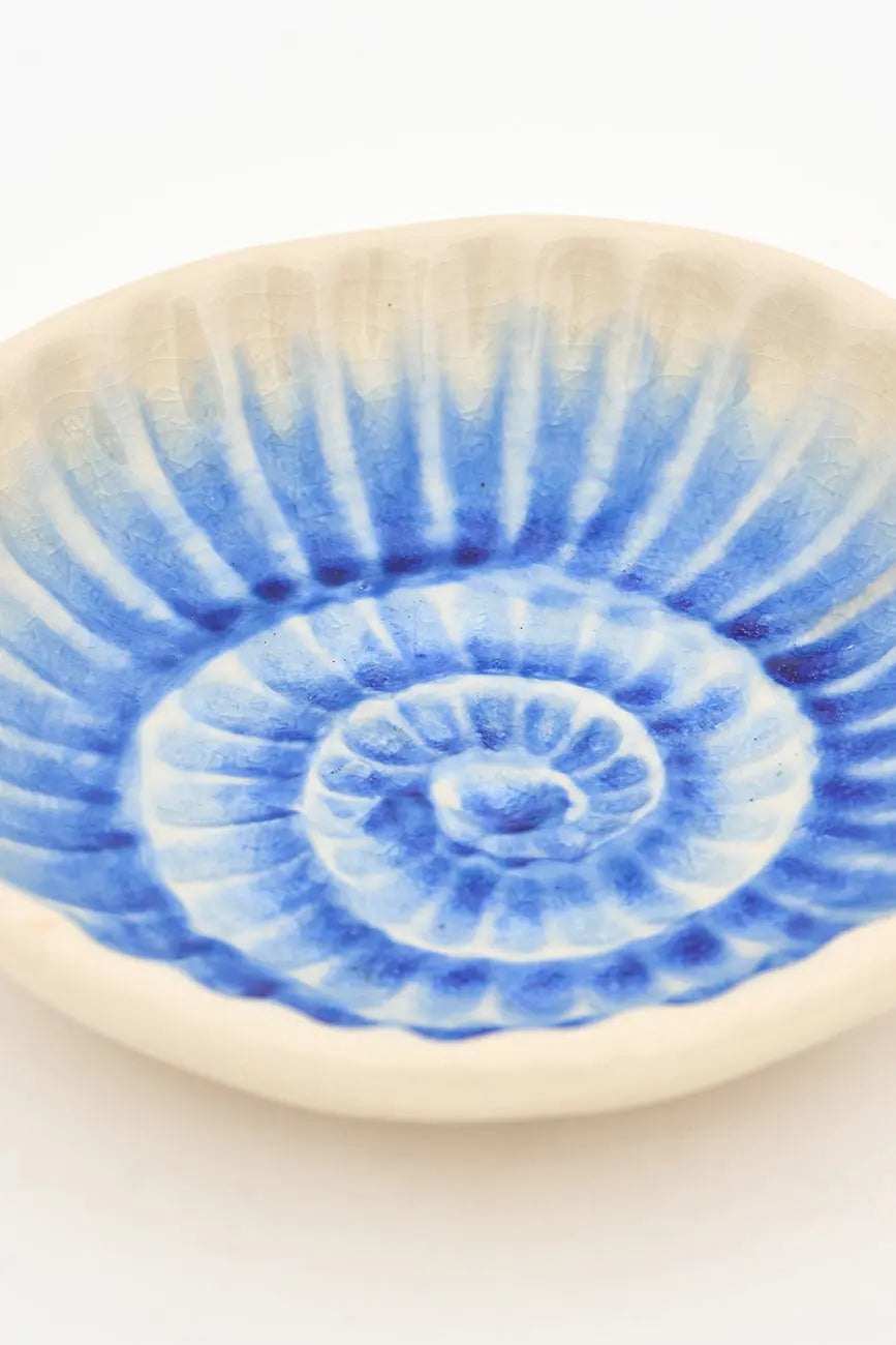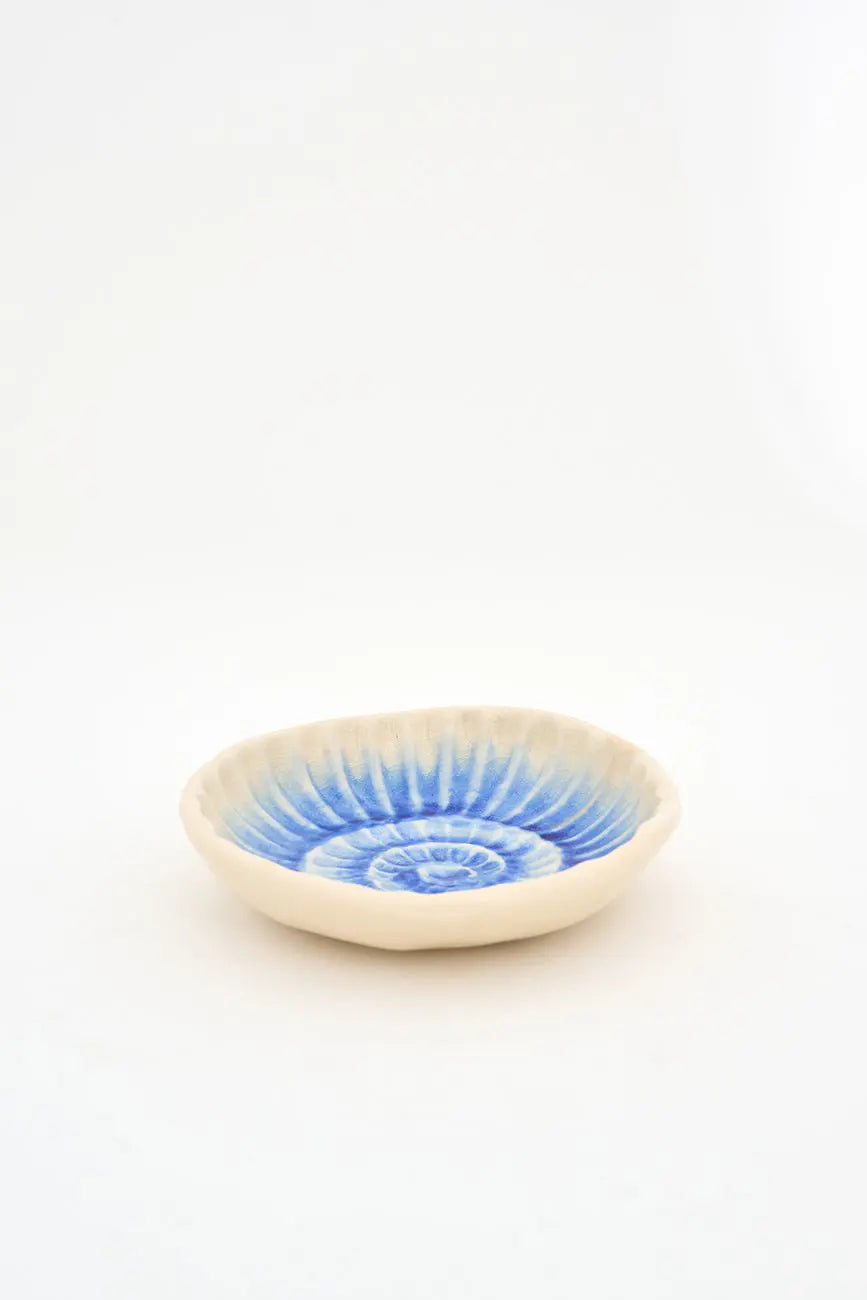 Plato con una caracola de color azul pintada en el cuenco. Original plato con una caracola de color azul pintada en el cuenco que añade el característico toque marinero de batela a cualquier rincón o estantería del hogar. Dimensiones: h: 4 cm – ø: 15 cm.