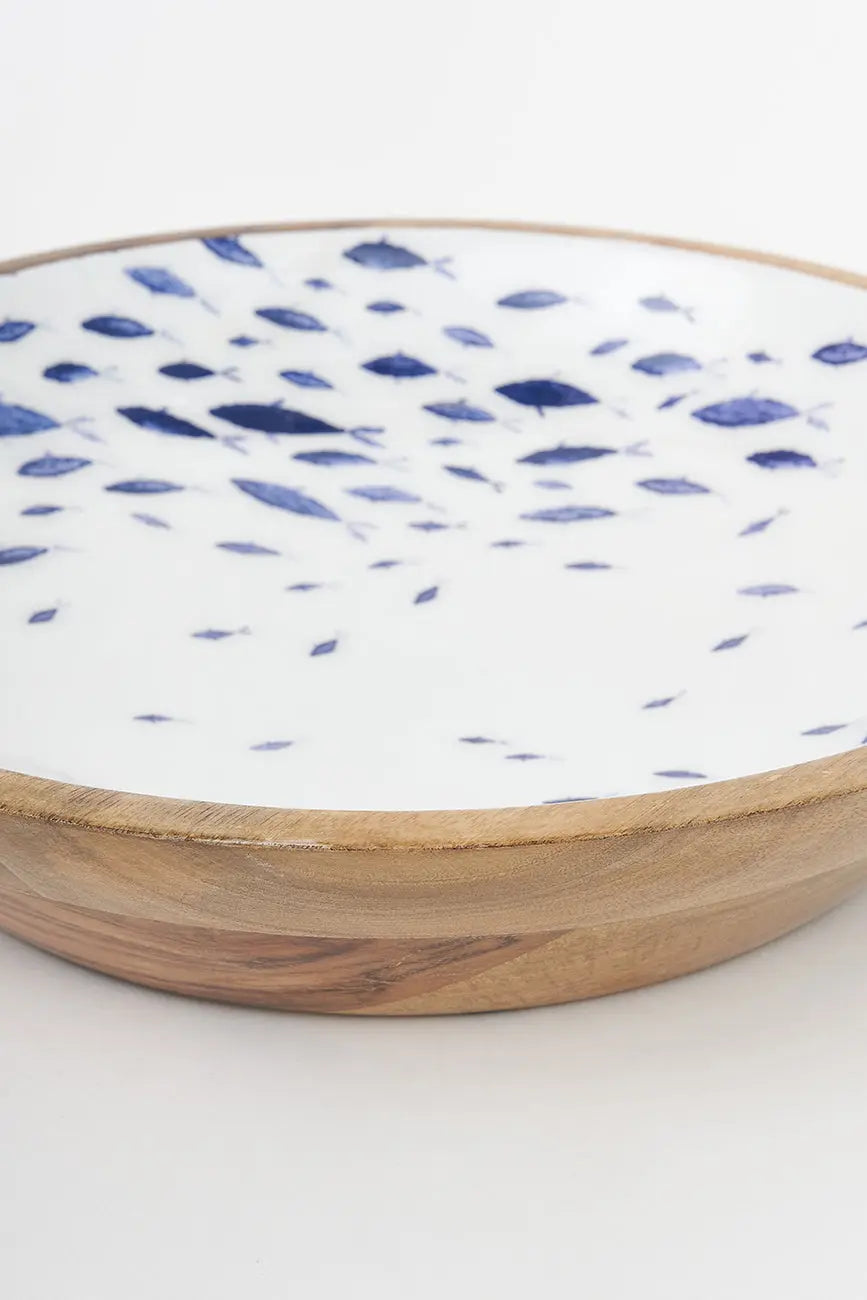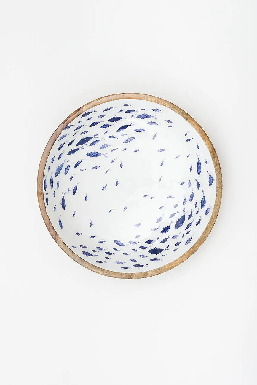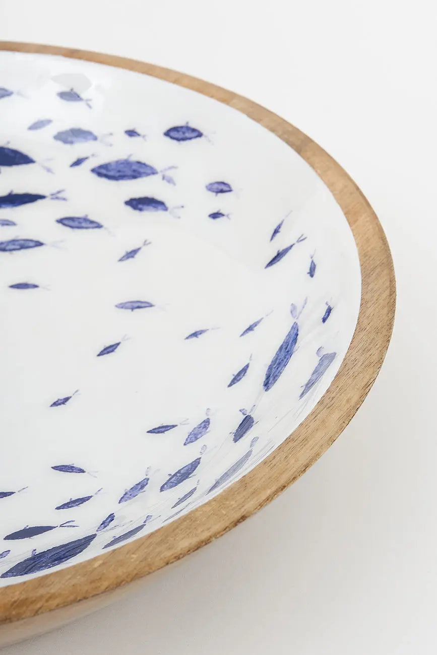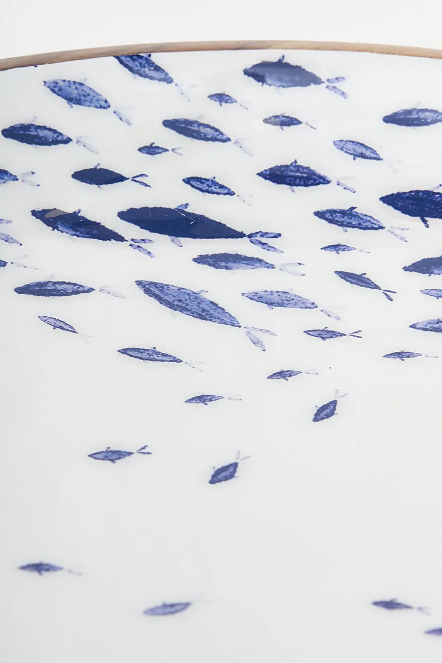 Bol mediano de madera esmaltada con un encantador diseño de peces azules, perfecto para dar un toque náutico a tu mesa. Ideal para servir tapas, ensaladas o como pieza decorativa. Dimensiones: h: 7 cm – ø: 35 cm.