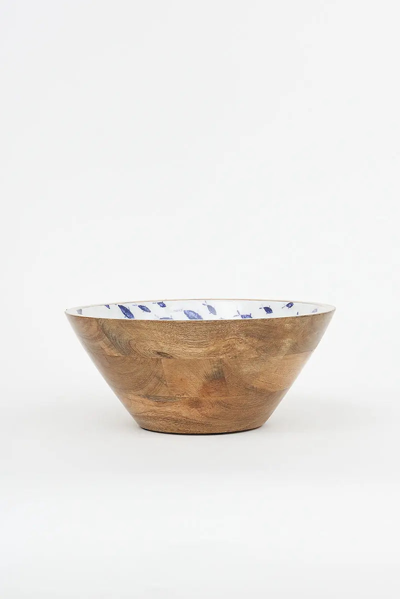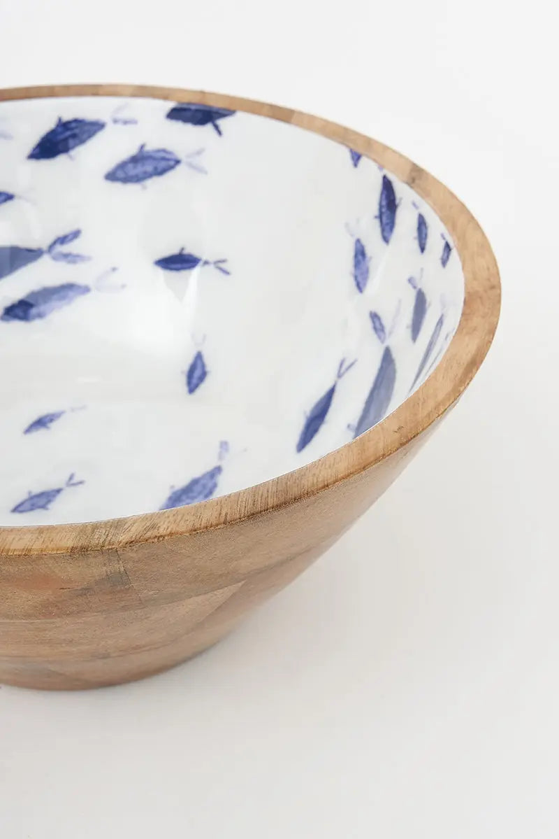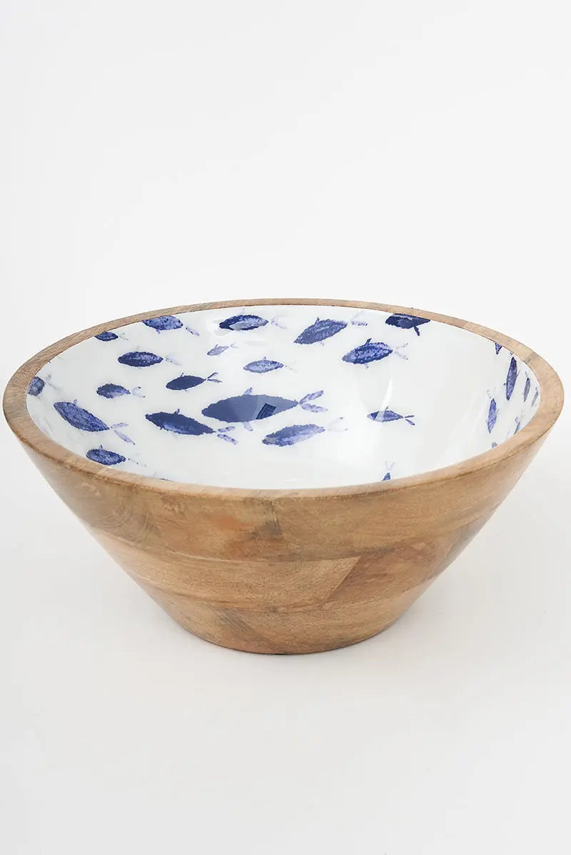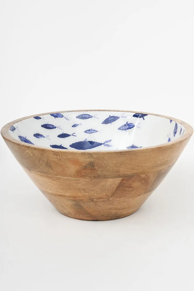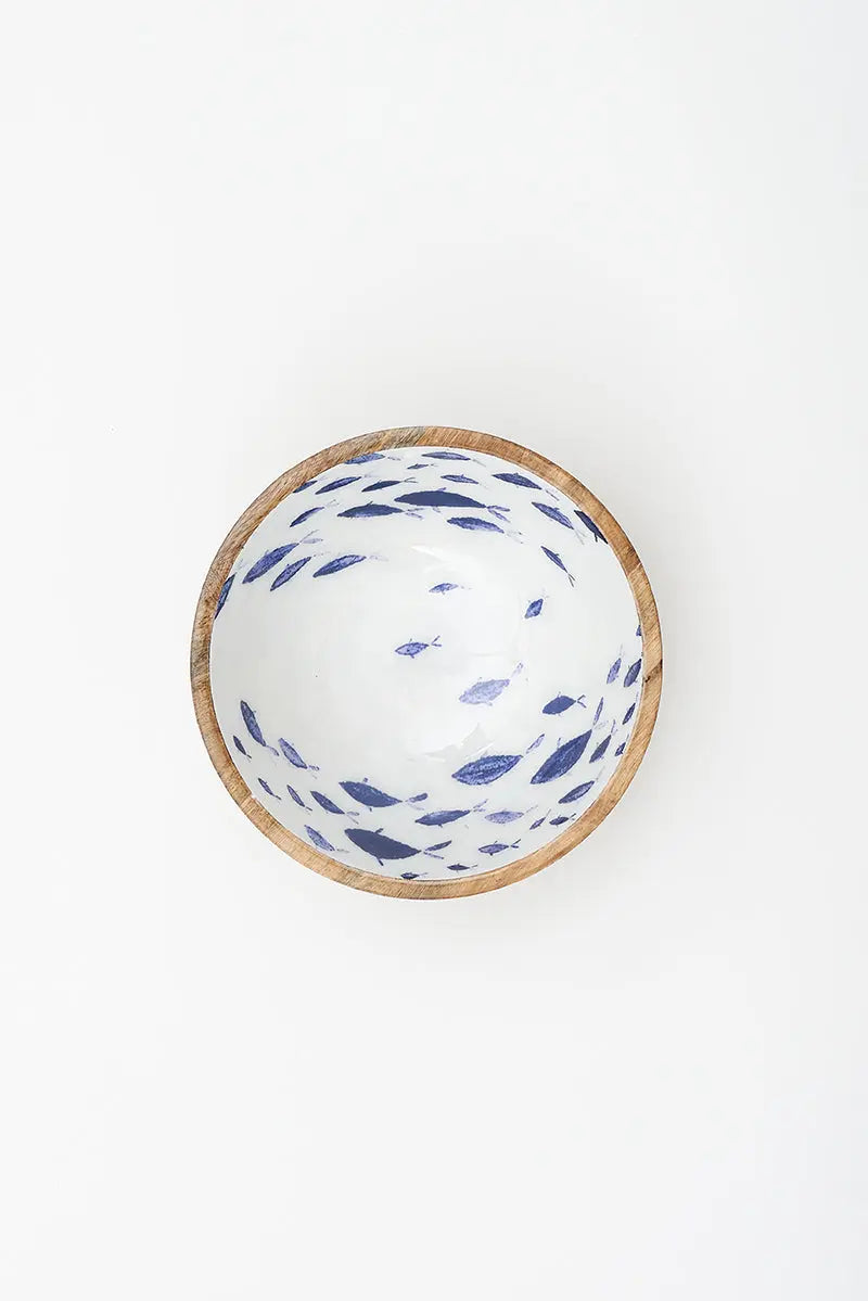 Bol de madera cuya parte interior está pintada en blanco y tiene un banco de peces pintado en azul. La parte interior va esmaltada. Un regalo náutico perfecto. Dimensiones: h: 9,5 cm – ø: 24,5 cm.