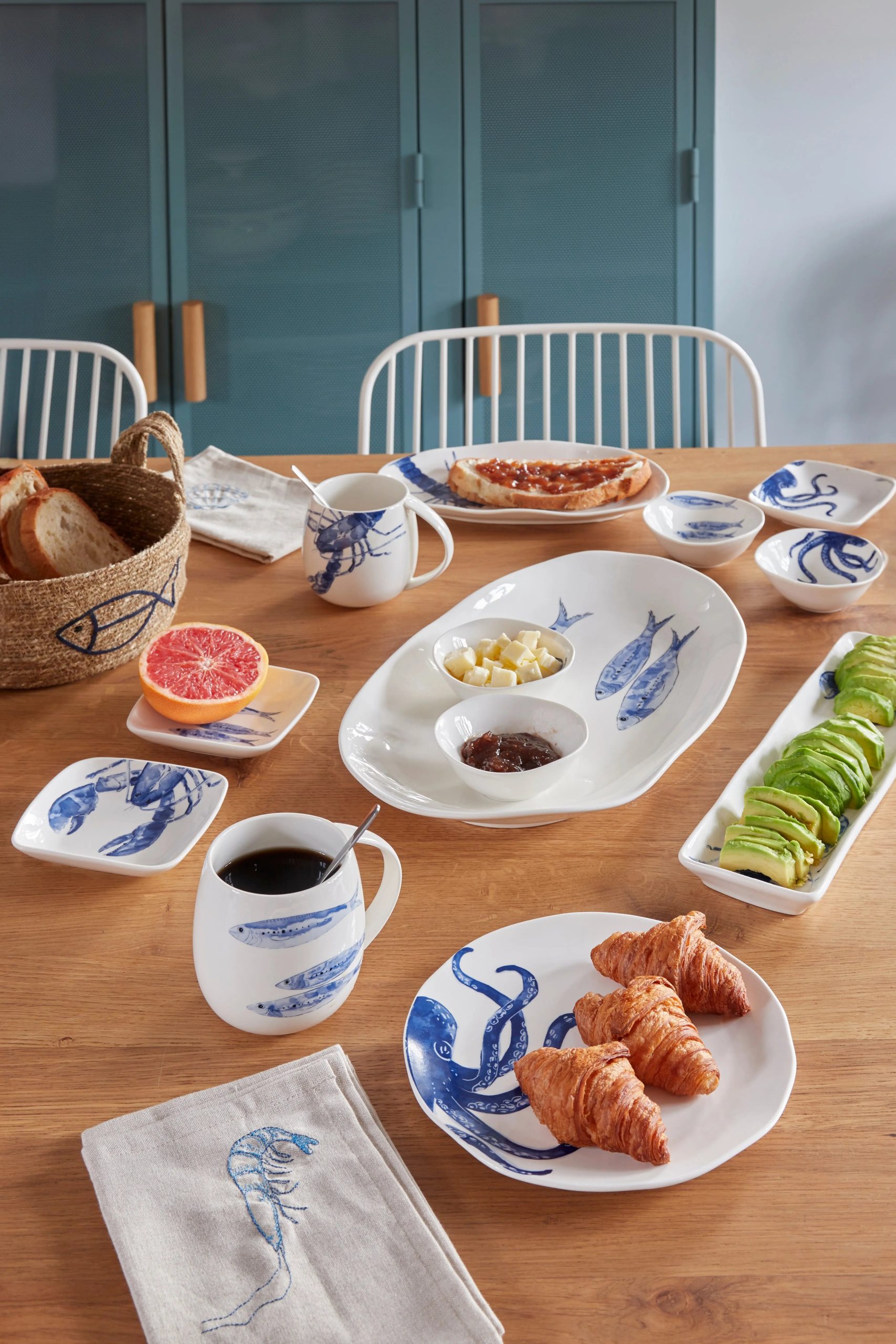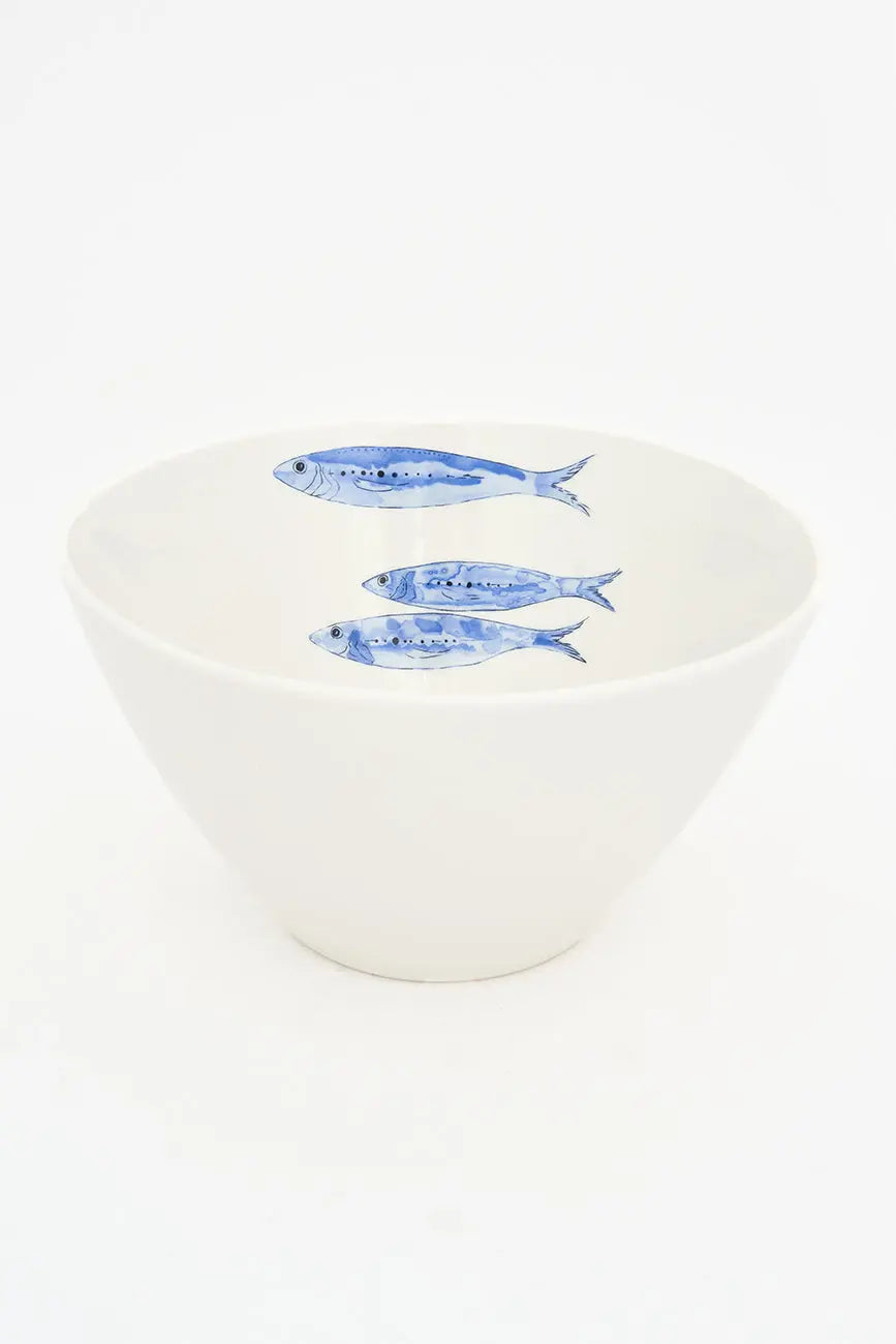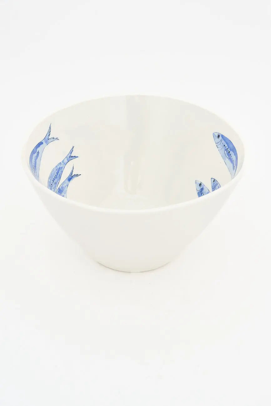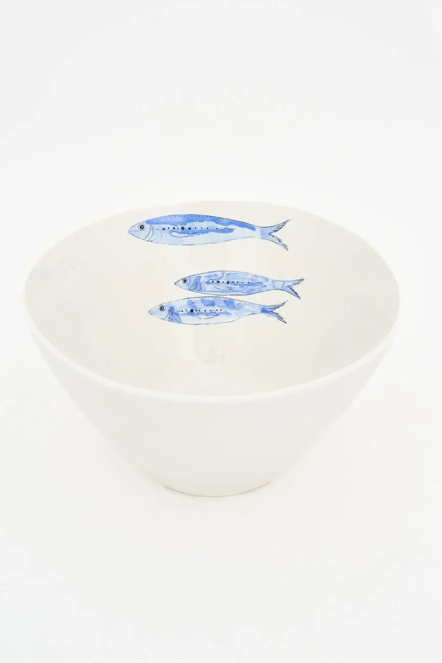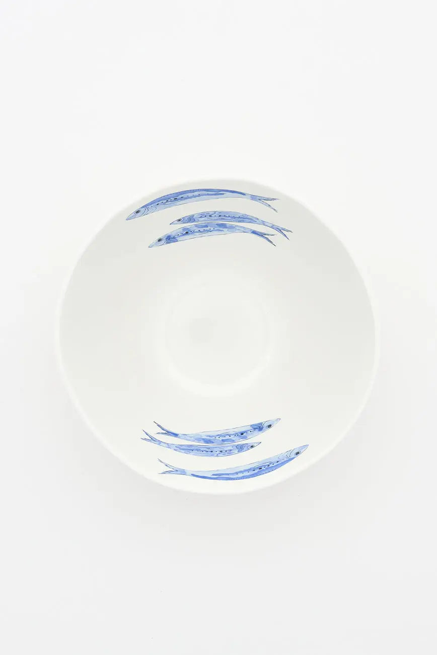 Bol de cerámica decorado con un delicado diseño de peces azules, perfecto para añadir un toque marinero a tu mesa. Dimensiones: h: 12 cm – ø: 22 cm.