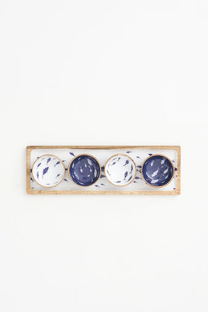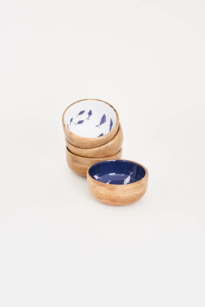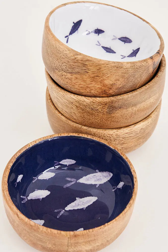 Set de 4 boles de madera esmaltada con peces: estilo y funcionalidad náutica experimenta la auténtica esencia náutica con nuestro set de 4 boles de madera esmaltada. Con un diseño en azul y blanco que presenta encantadores peces, estos boles no solo son visualmente atractivos, sino también funcionales. Dimensiones: h: 4,5 cm – ø: 8,5 cm.