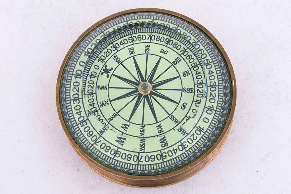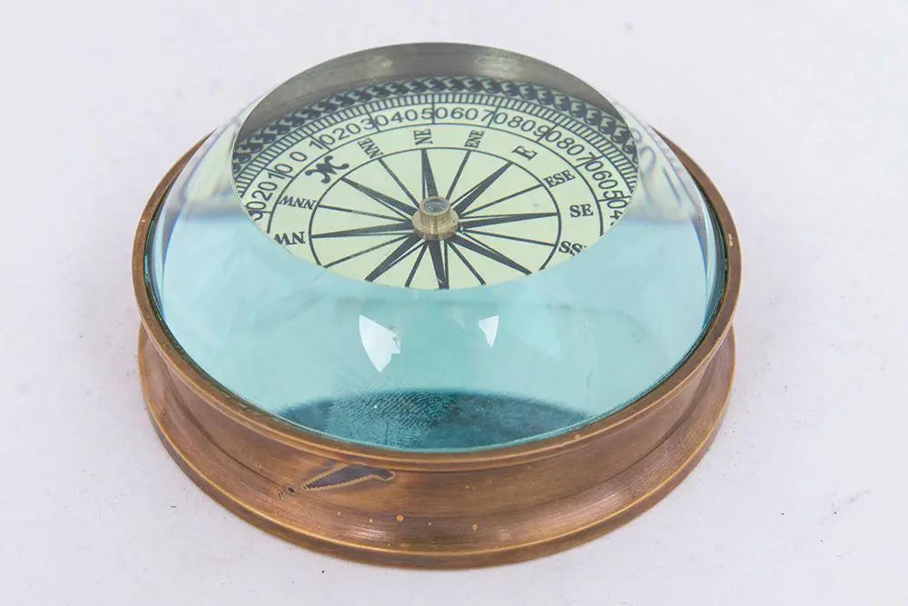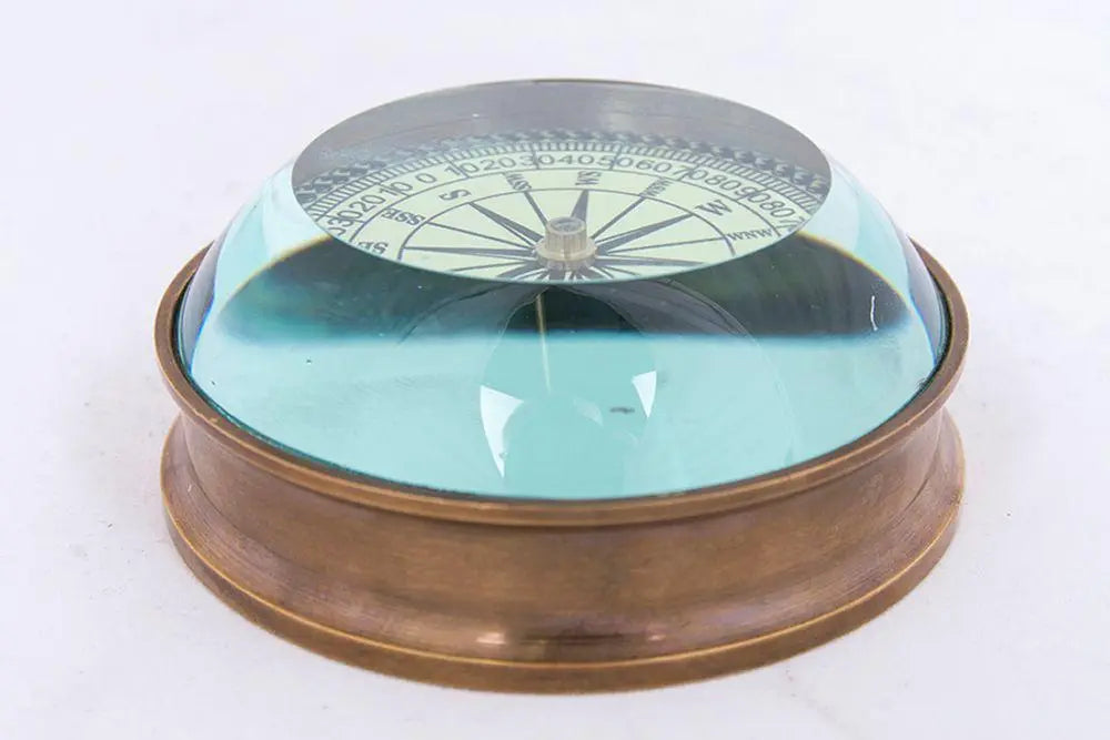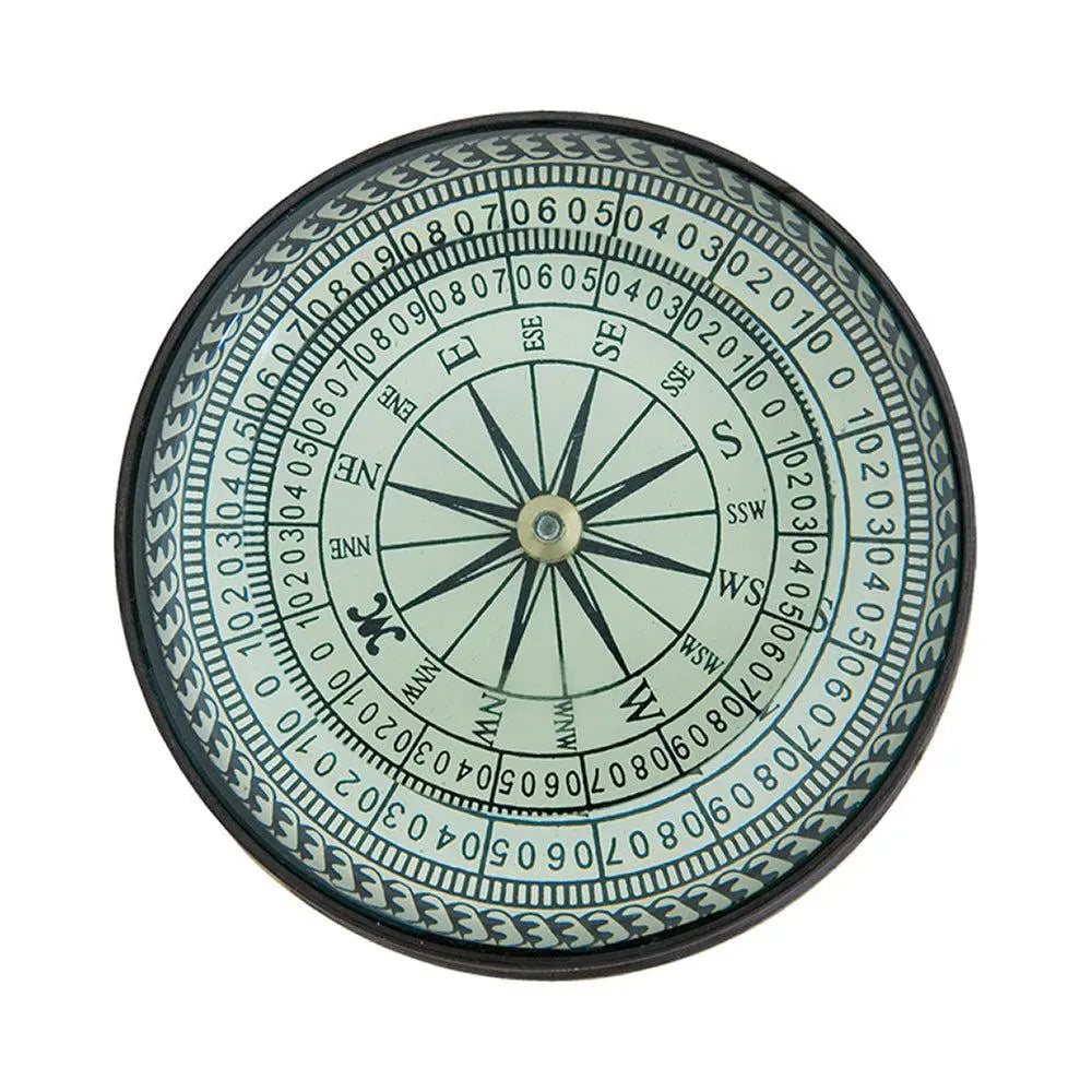 Decorativa brújula con lupa. Ideal como pisapapeles un elemento clásico y elegante. Es un elemento decorativo, una réplica; no un instrumento de orientación. Dimensiones: ø: 7,5 cm.