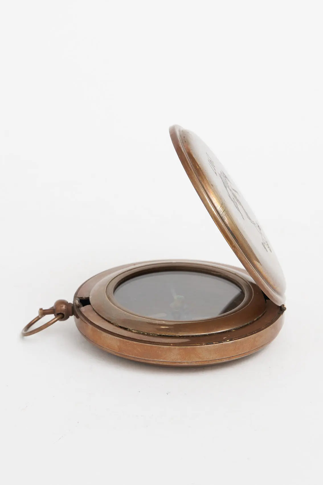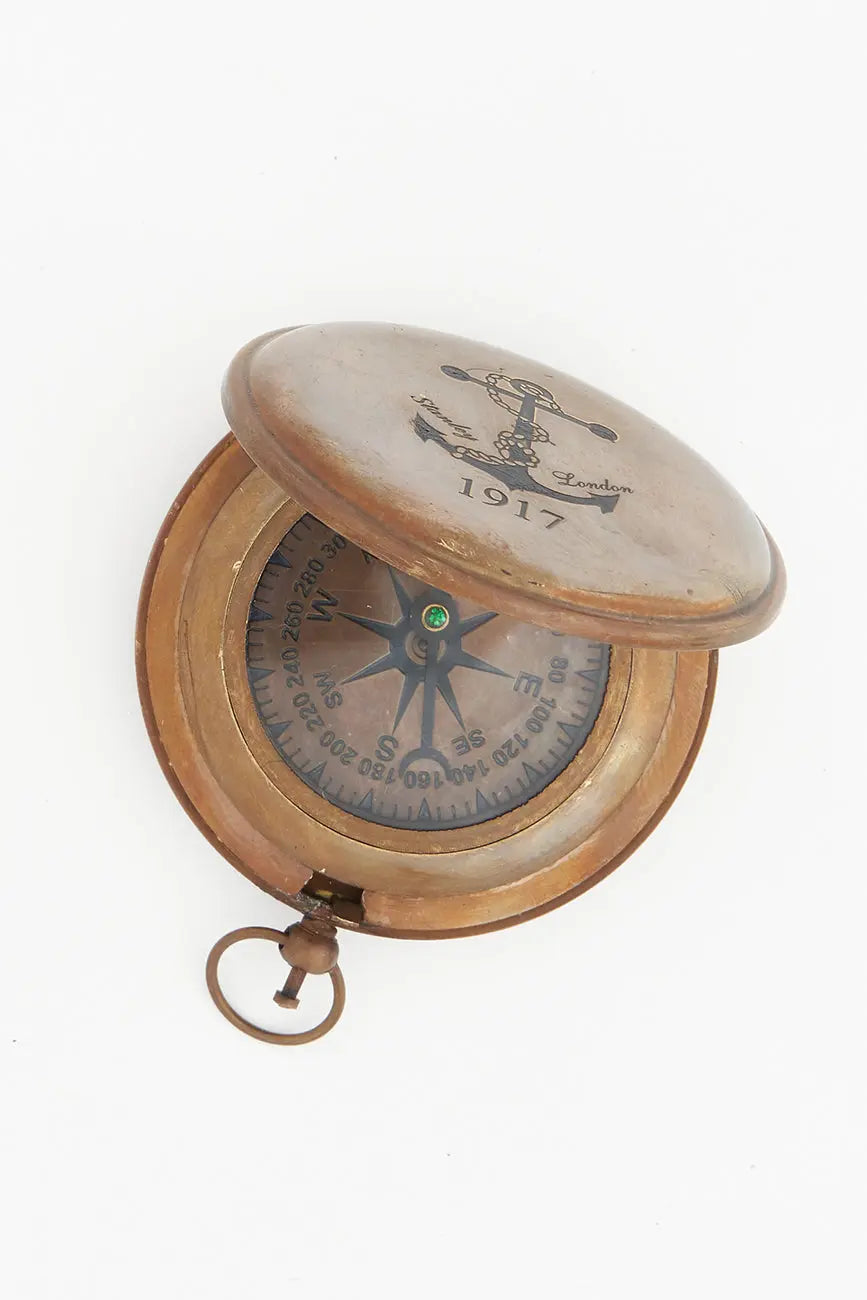 Brújula de bolsillo en latón. Bonito objeto para ese regalo especial y distinguido. Es un elemento decorativo, una réplica; no un instrumento de orientación. Dimensiones: ø: 7,5 cm.