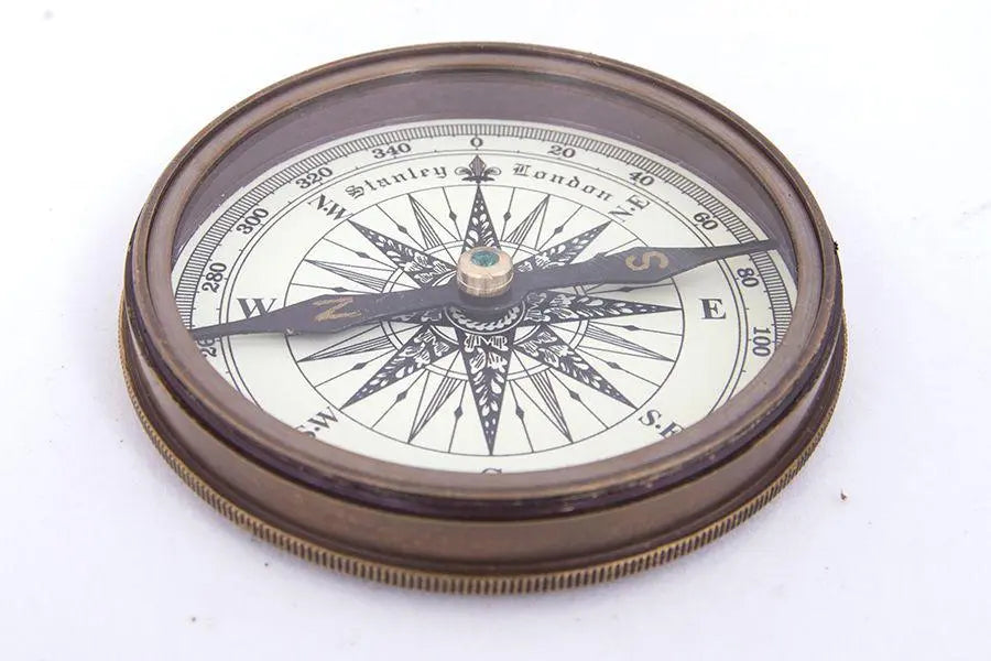 Brújula decorativa de latón inspirada en los antiguos instrumentos náuticos. Presentada en un elegante estuche de cuero, evoca el estilo vintage de las embarcaciones clásicas. Aunque no funciona como instrumento de orientación, es una réplica ideal como pieza decorativa o regalo con carácter marinero. Dimensiones: ø: 7,5 cm.