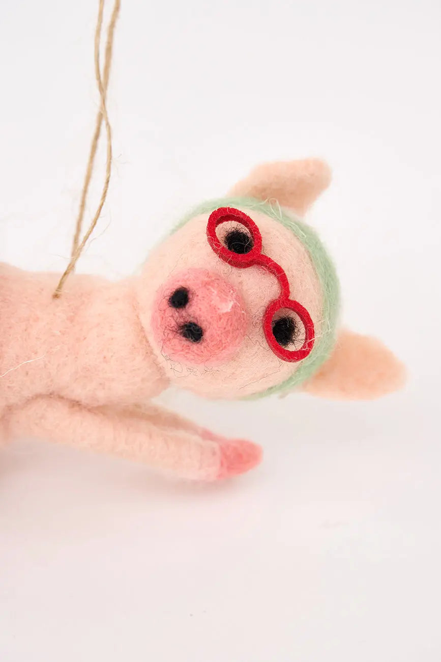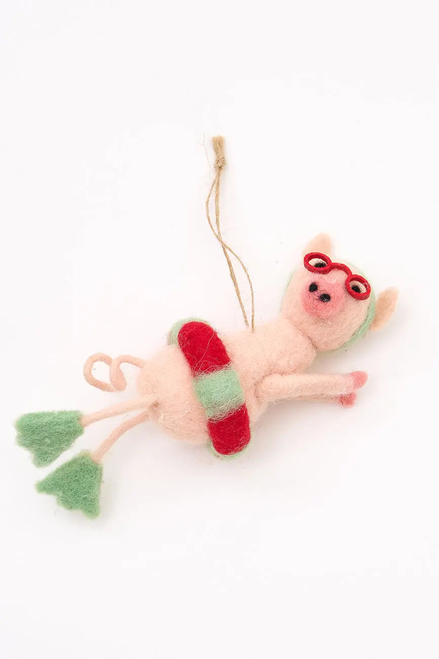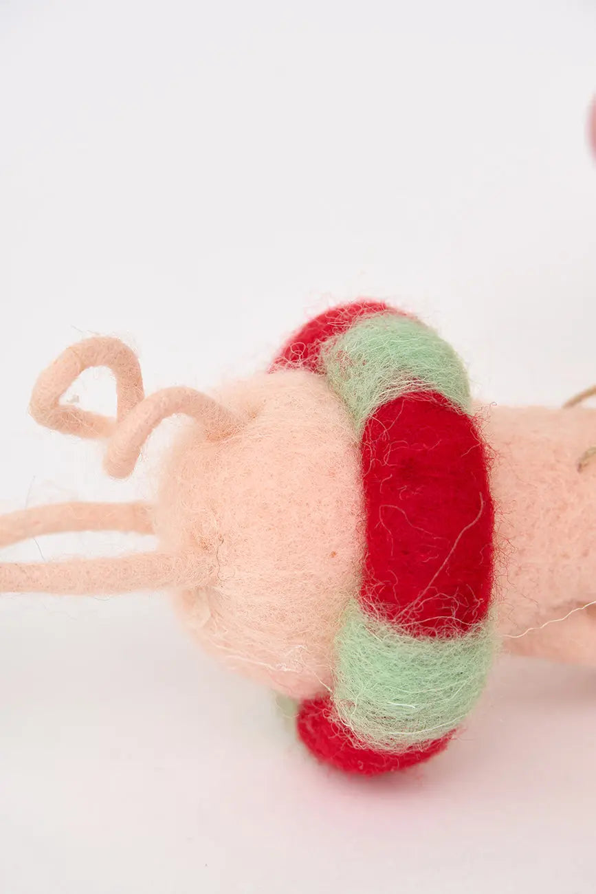 Colgante en fieltro con una cerdita nadadora. Dimensiones: l: 16 cm – w: 5 cm – h: 7 cm.