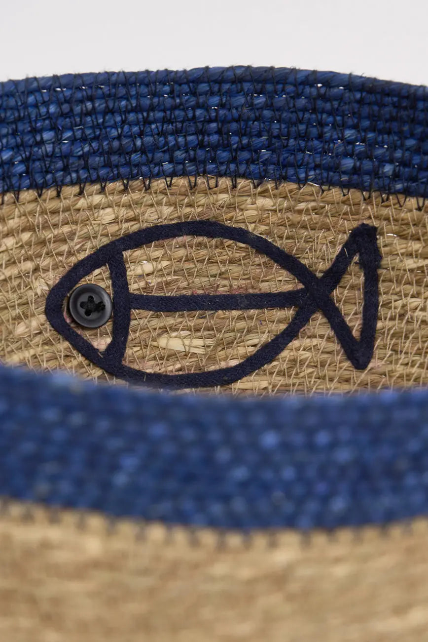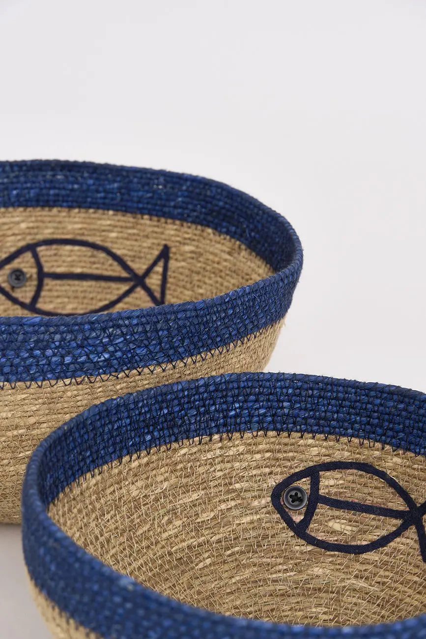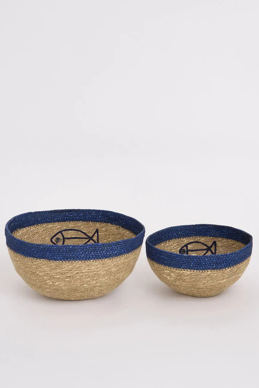 Set de dos cestas de yute con figura de pez este set de dos cestas de yute, decoradas con una encantadora figura de pez, es perfecto para aportar un toque natural y marinero a cualquier espacio. Su diseño artesanal y material resistente las hacen ideales para organizar objetos pequeños, ropa o accesorios, manteniendo el orden con estilo. Dimensiones: h: 14 cm – ø: 28 cm.