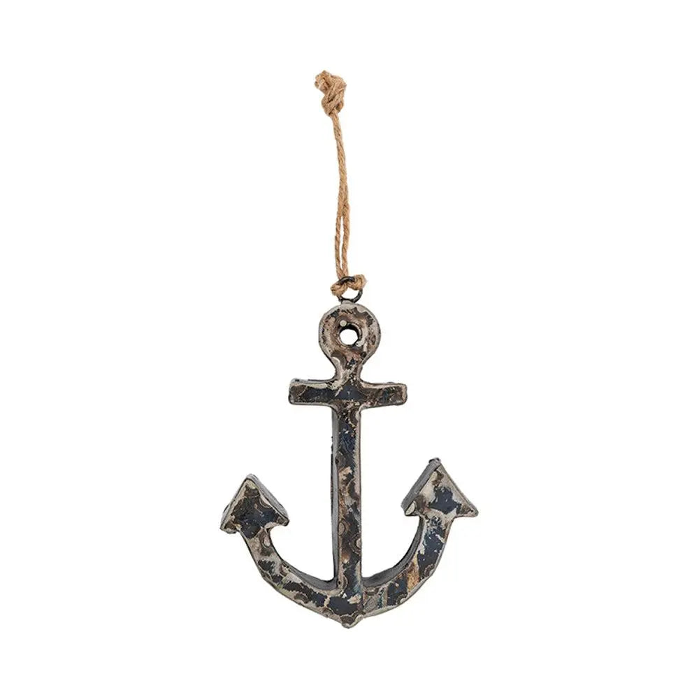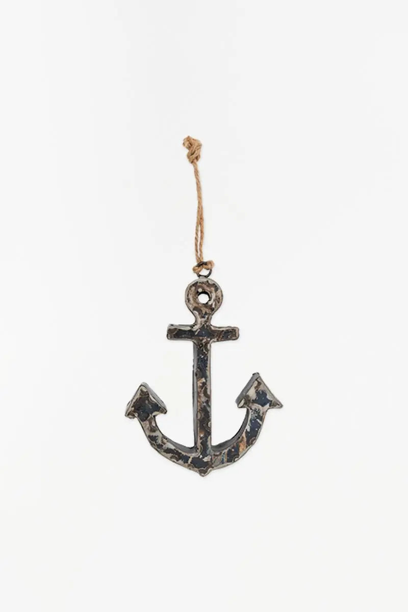 Colgante de chapa de bidón reciclado con forma de ancla. Viene con una cuerda. Un detalle original y divertido para el hogar. Dimensiones: l: 10 cm – h: 15 cm.
