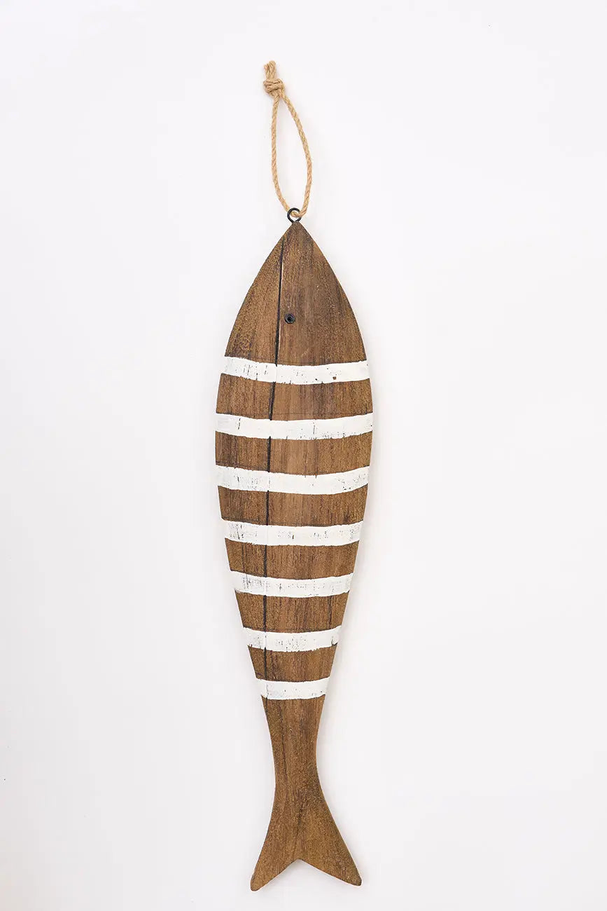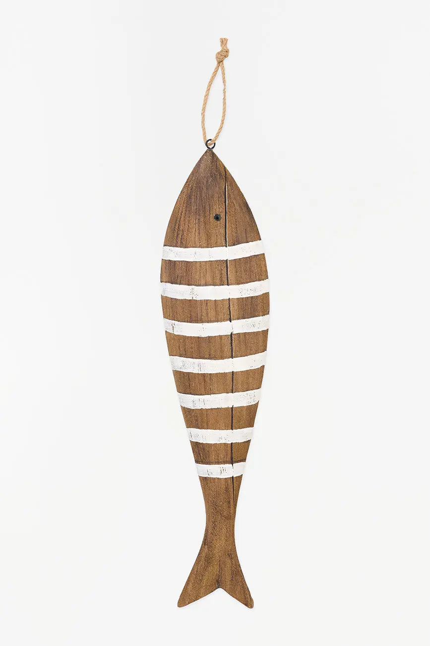 Colgante de madera con forma de pez a rayas blancas, perfecto para añadir un toque náutico a tu decoración. Ideal para puertas, ventanas o como adorno en la pared. Dimensiones: l: 45 cm – w: 11 cm – h: 3,5 cm.