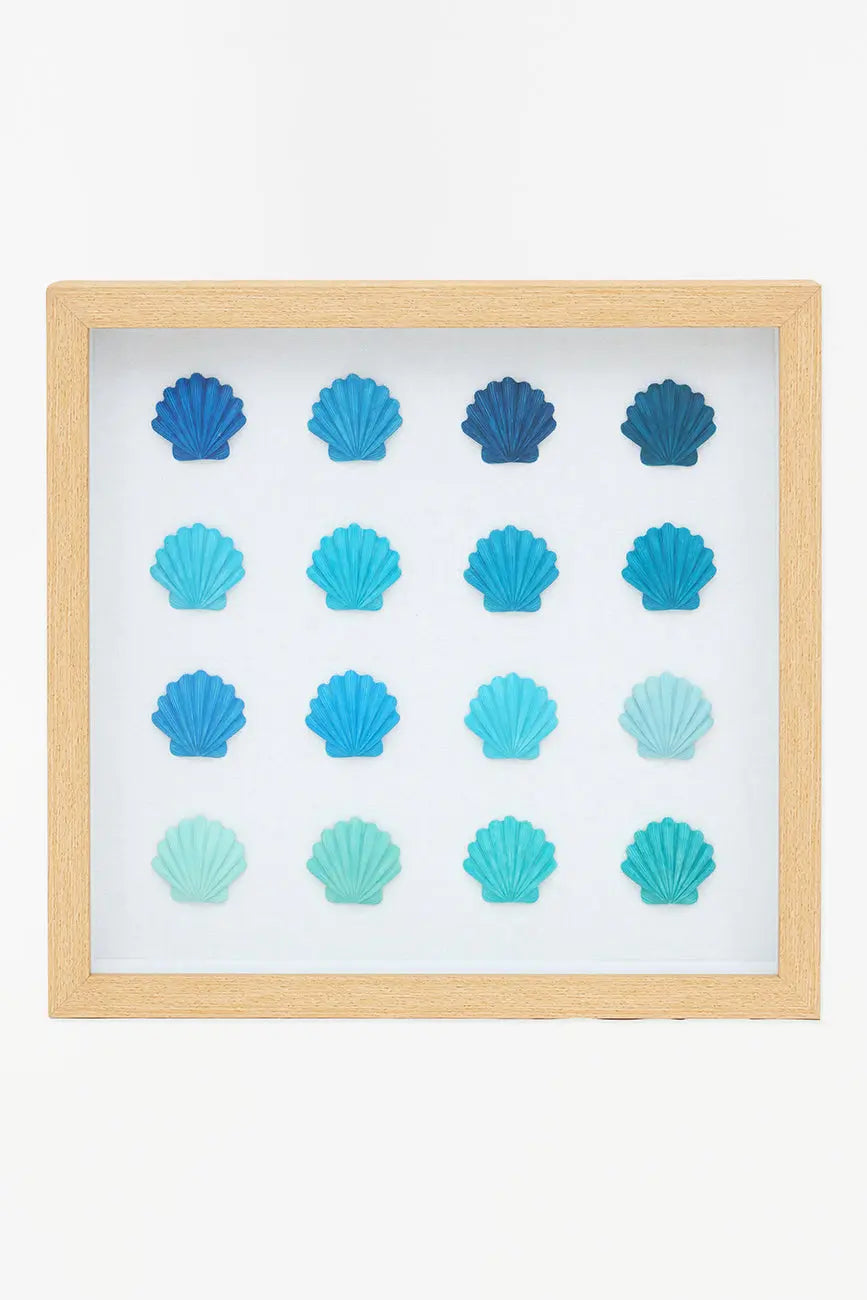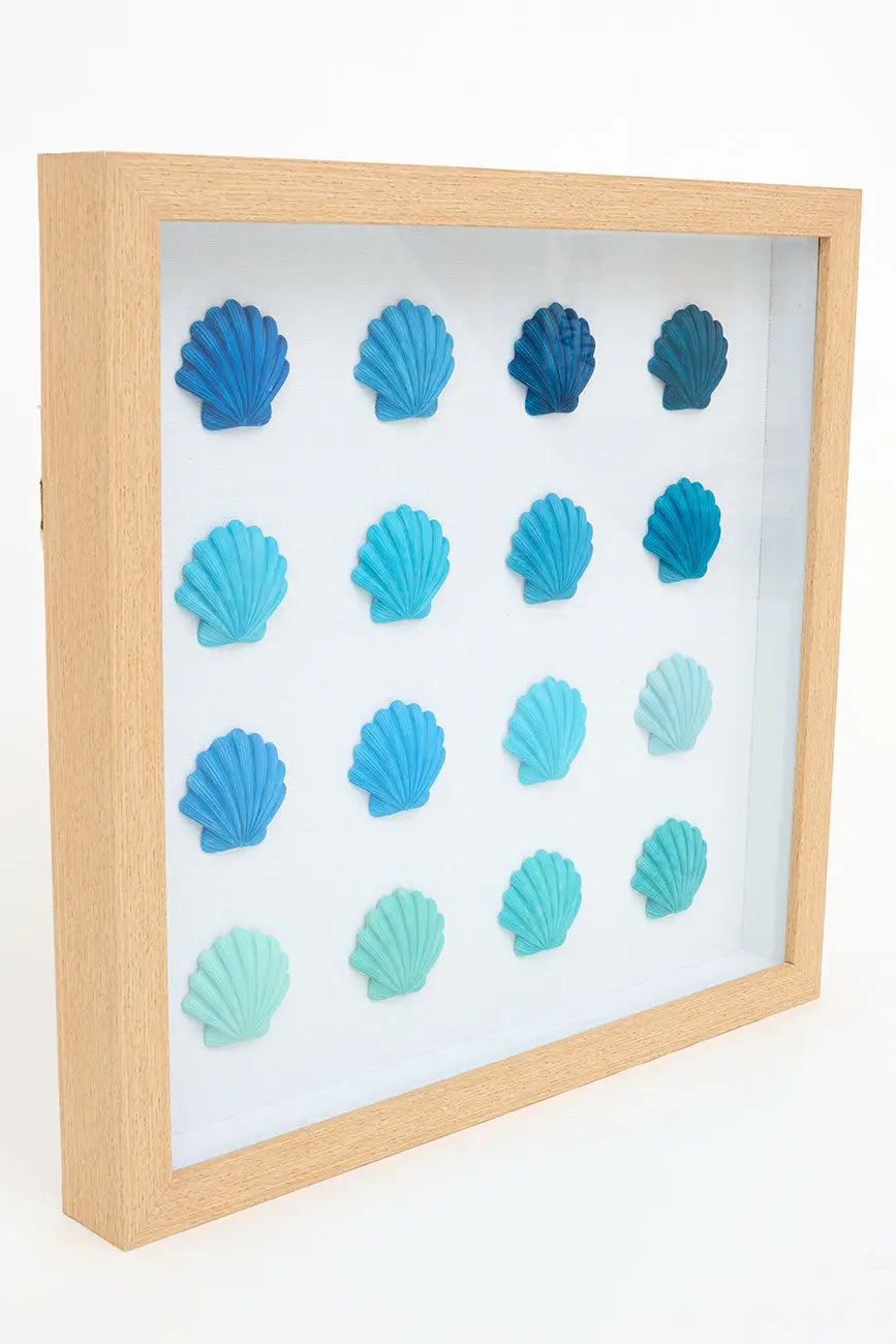 Cuadro de conchas marinas en una hermosa gama de colores azules. Perfecto para evocar la serenidad del océano y enriquecer tu decoración con un toque marino. Dimensiones: l: 47 cm – h: 44,5 cm.