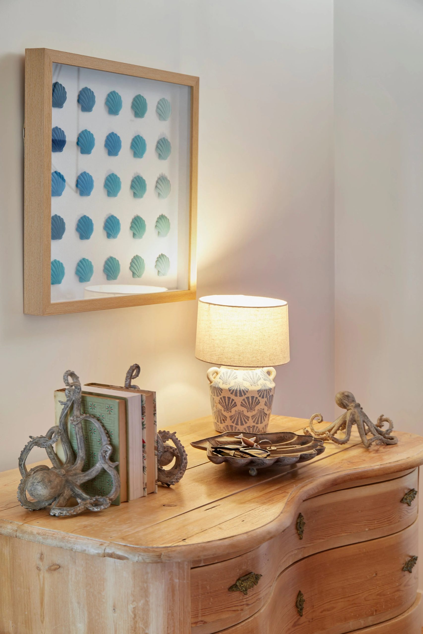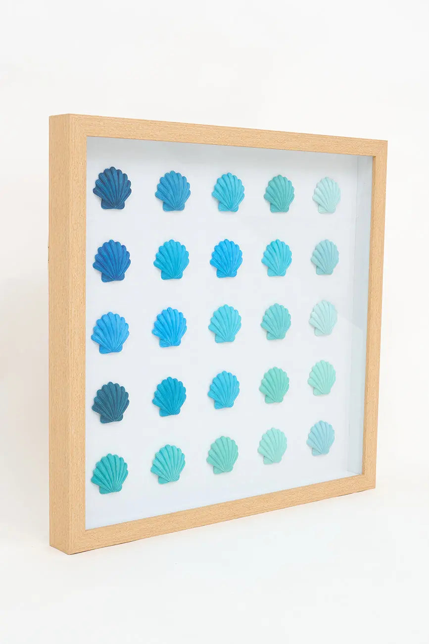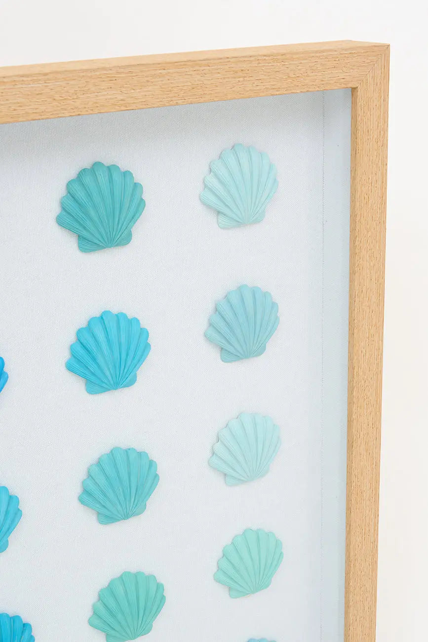 Cuadro de conchas marinas en una hermosa gama de colores azules. Perfecto para evocar la serenidad del océano y enriquecer tu decoración con un toque marino. Dimensiones: l: 57 cm – h: 55 cm.