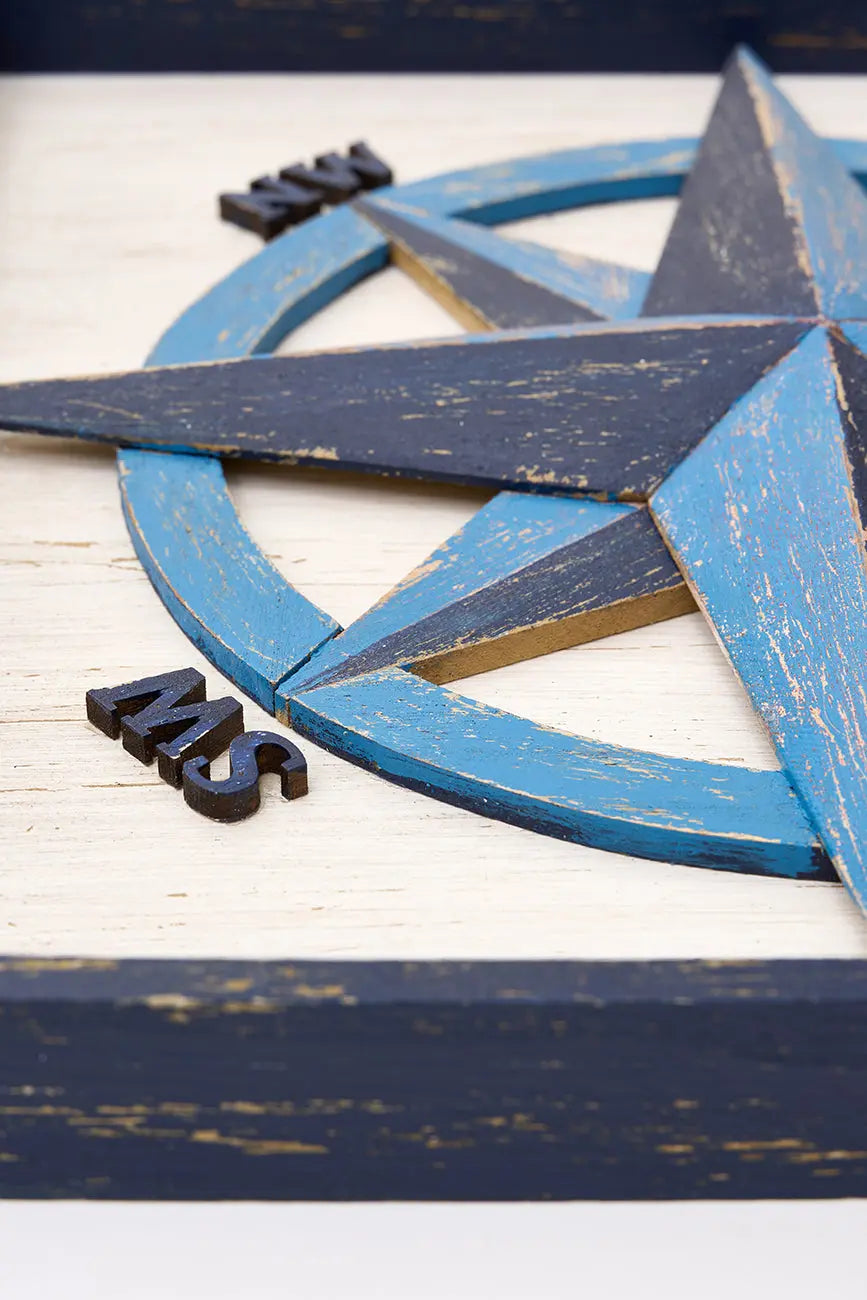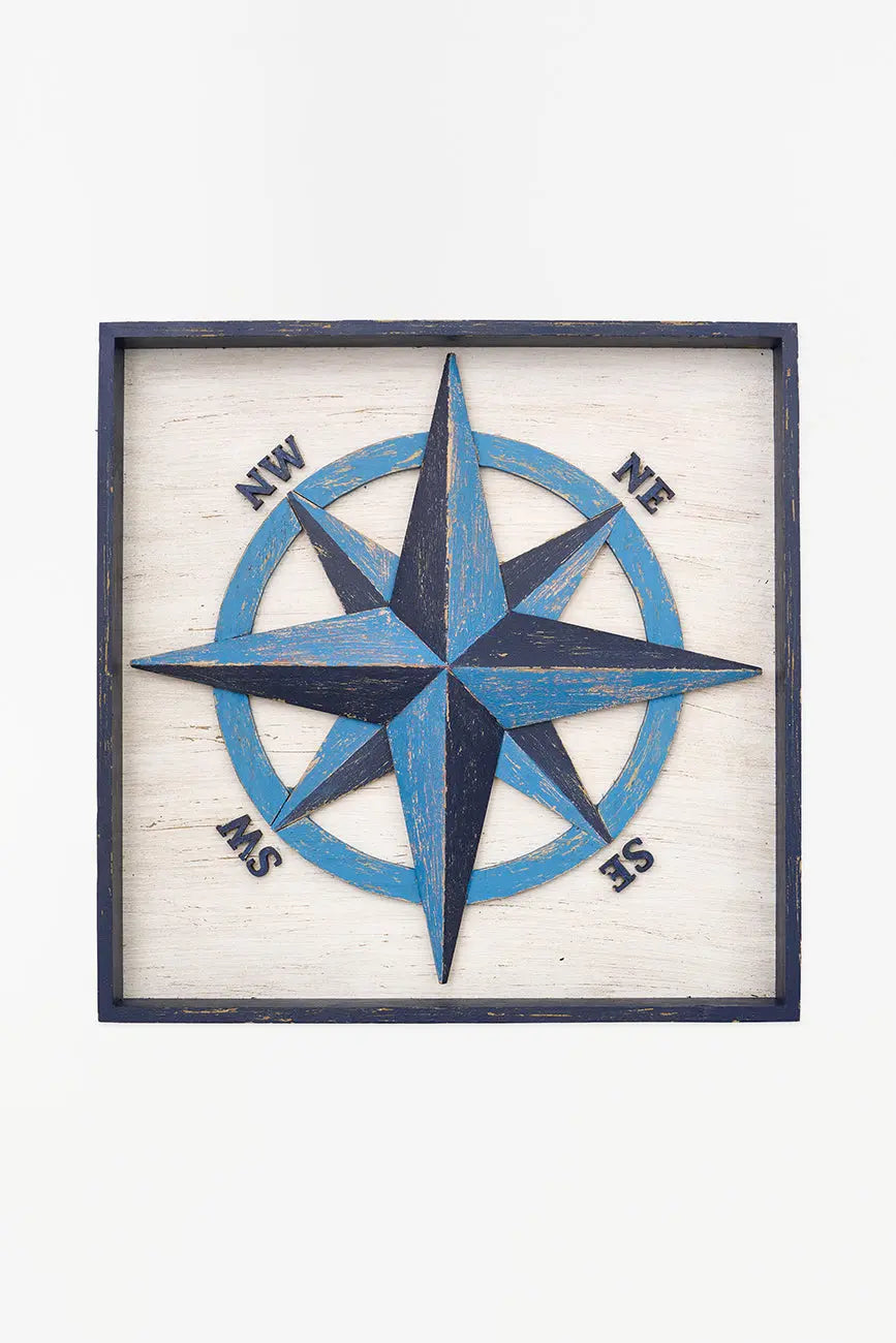 Cuadro de rosa de los vientos de madera envejecida. Este cuadro decorativo de madera envejecida presenta una detallada rosa de los vientos, símbolo clásico de orientación y aventura marítima. Su acabado desgastado le confiere un aire rústico y vintage, ideal para crear una atmósfera náutica y atemporal. Dimensiones: l: 37 cm – w: 4 cm – h: 37 cm.