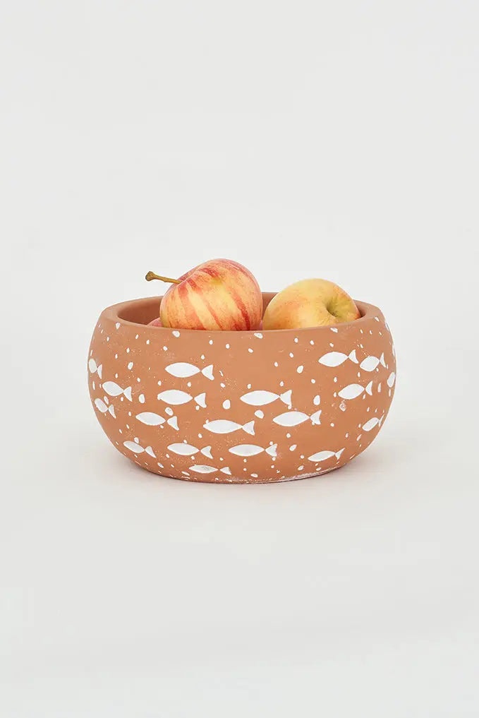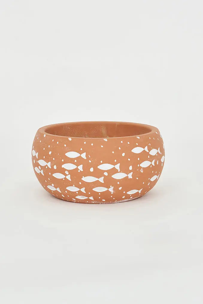 Cuenco de cemento en color arcilla con peces blancos: estilo náutico rústico pura autenticidad estilo náutico con nuestro cuenco de cemento en color arcilla con pequeños peces blancos. Este cuenco rústico no solo sirve como pieza decorativa, sino que también es funcional, ideal para servir ensaladas, frutas o aperitivos con un toque marino. Los pequeños peces blancos esculpidos añaden un encanto distintivo. Dimensiones: h: 10 cm – ø: 20 cm.