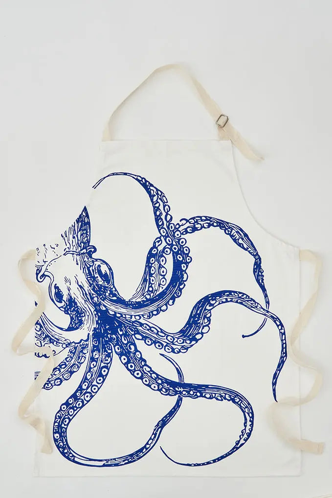 Delantal con pulpo azul en algodón grueso: robustez y diseño marino en tu cocina. Este delantal, hecho de algodón grueso y adornado con un pulpo azul, es ideal para quienes buscan durabilidad y estilo en la cocina. Su diseño náutico no solo protege, sino que también añade un elemento decorativo único. Perfecto para cocineros caseros o profesionales que aman el tema marino. Dimensiones: l: 63,5 cm – h: 80 cm.