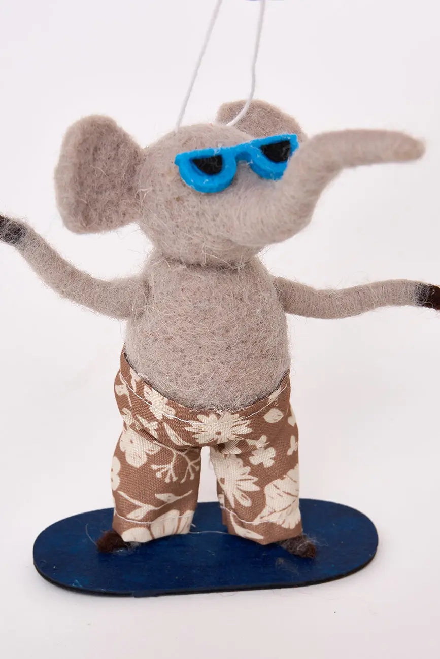Colgante en fieltro con un elefante snowboarder, un diseño divertido y original. Dimensiones: l: 10 cm – w: 6 cm – h: 11,5 cm.