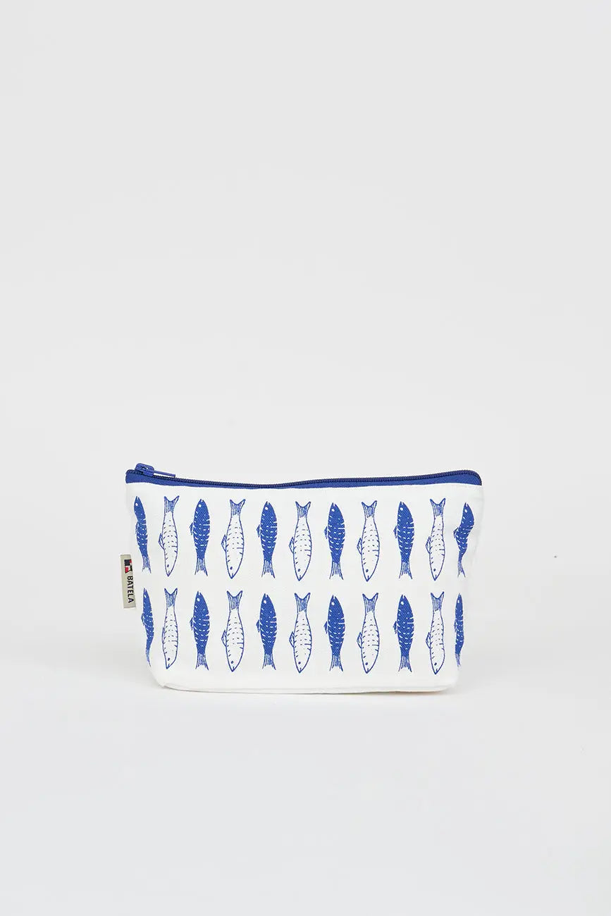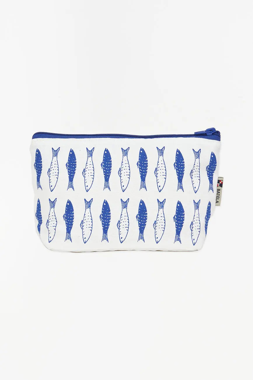 Estuche o neceser en algodón canvas con peces azules, perfecto para quienes buscan un accesorio funcional y con estilo náutico. Dimensiones: l: 24 cm – h: 13 cm.