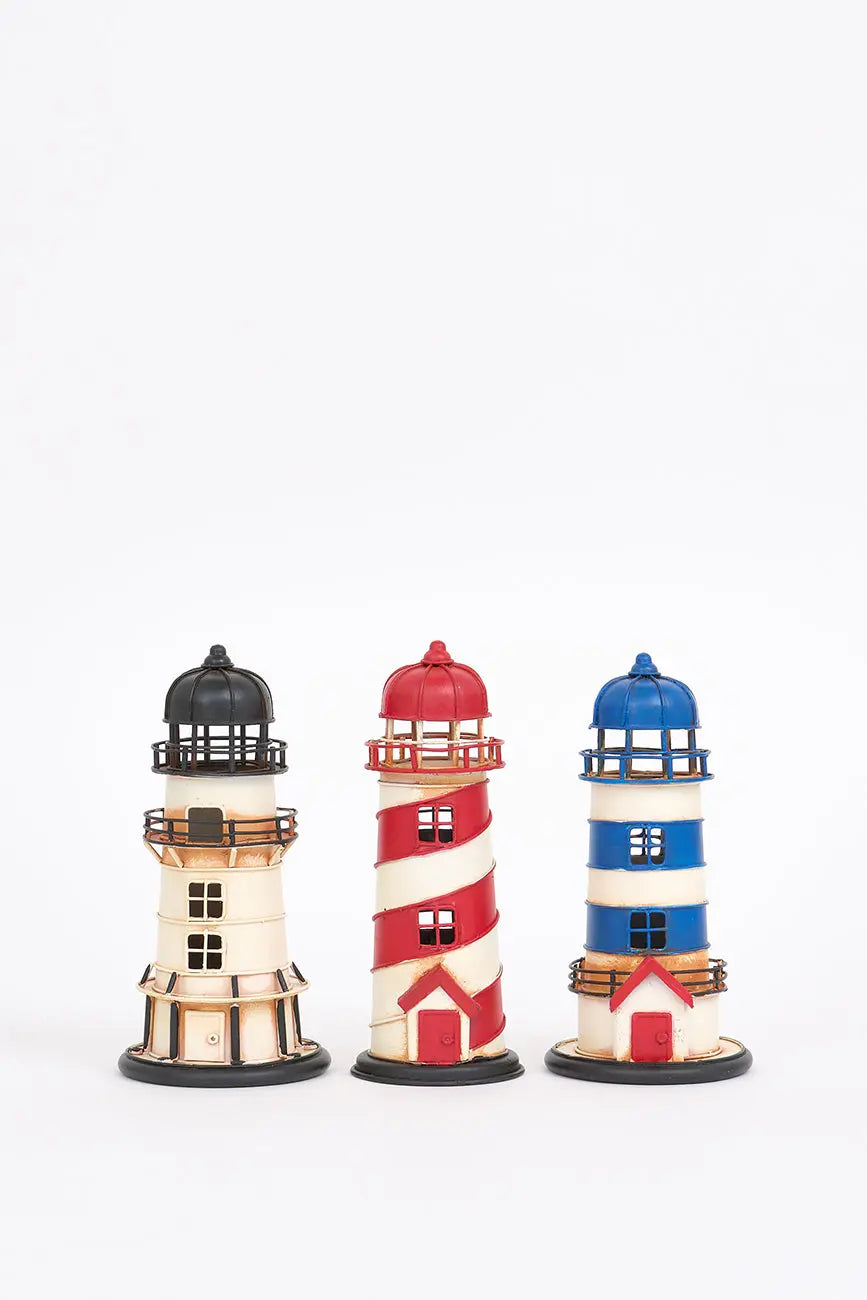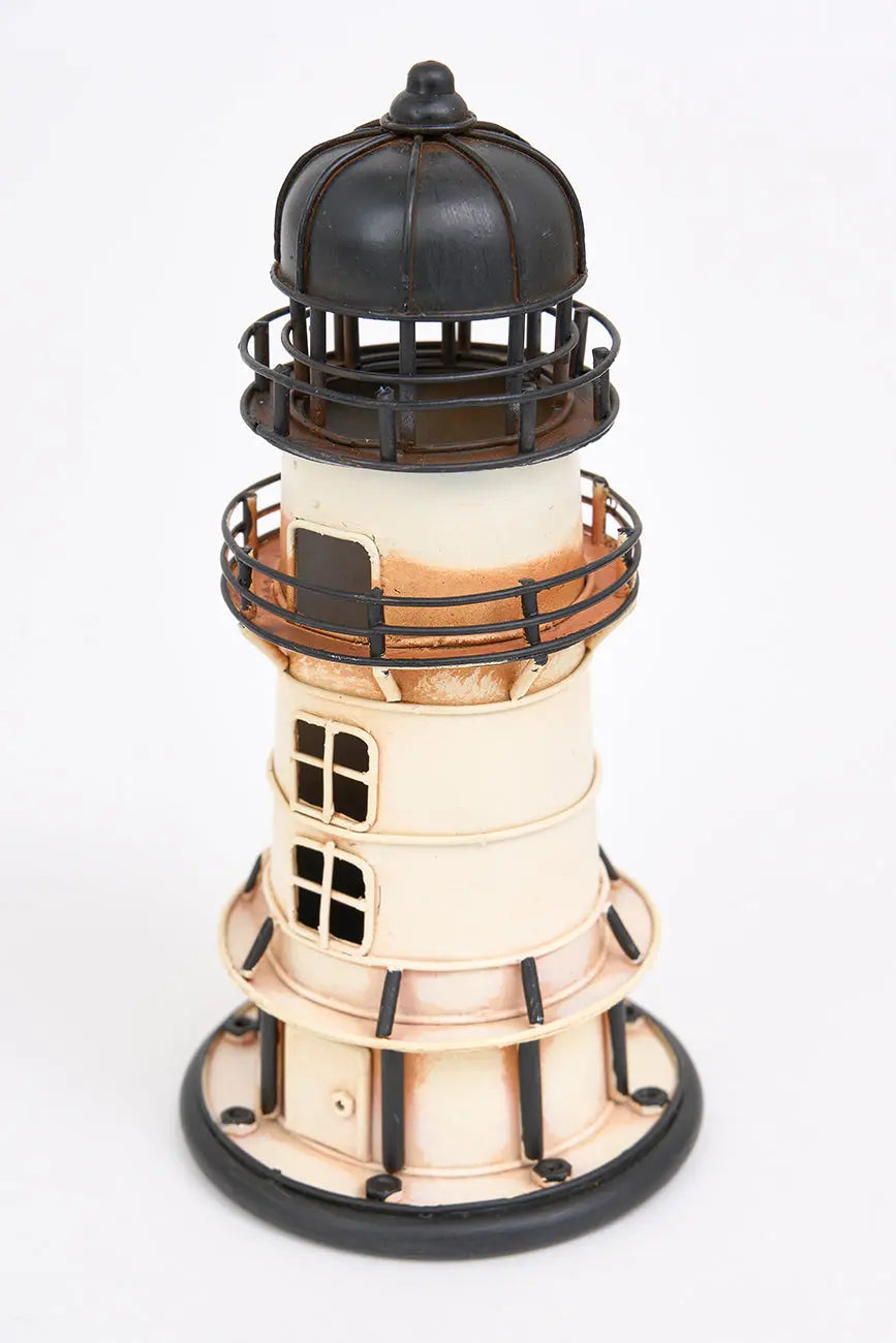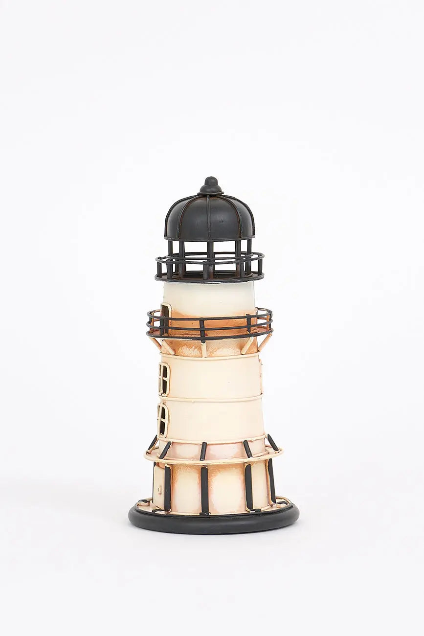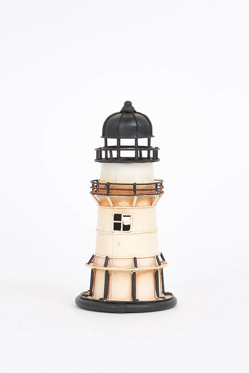Equeño faro decorativo beige y negro en metal, una pieza elegante que captura la esencia del estilo náutico y costero. Fabricado de metal de alta calidad, este faro presenta un diseño con tonos beige y negro, lo que lo convierte en una opción ideal para añadir un toque sobrio y sofisticado a tu decoración marinera. Dimensiones: h: 17 cm – ø: 8 cm.