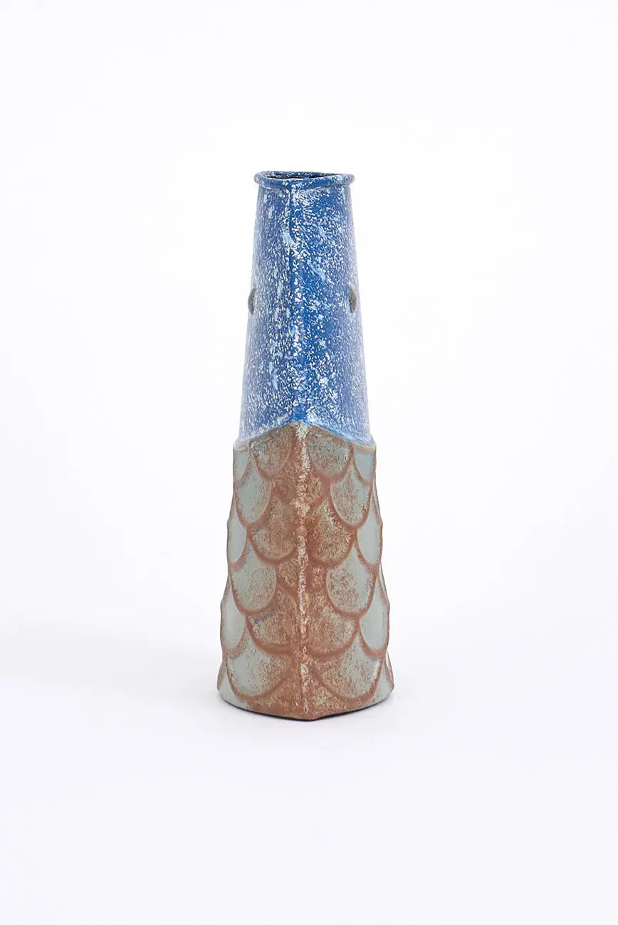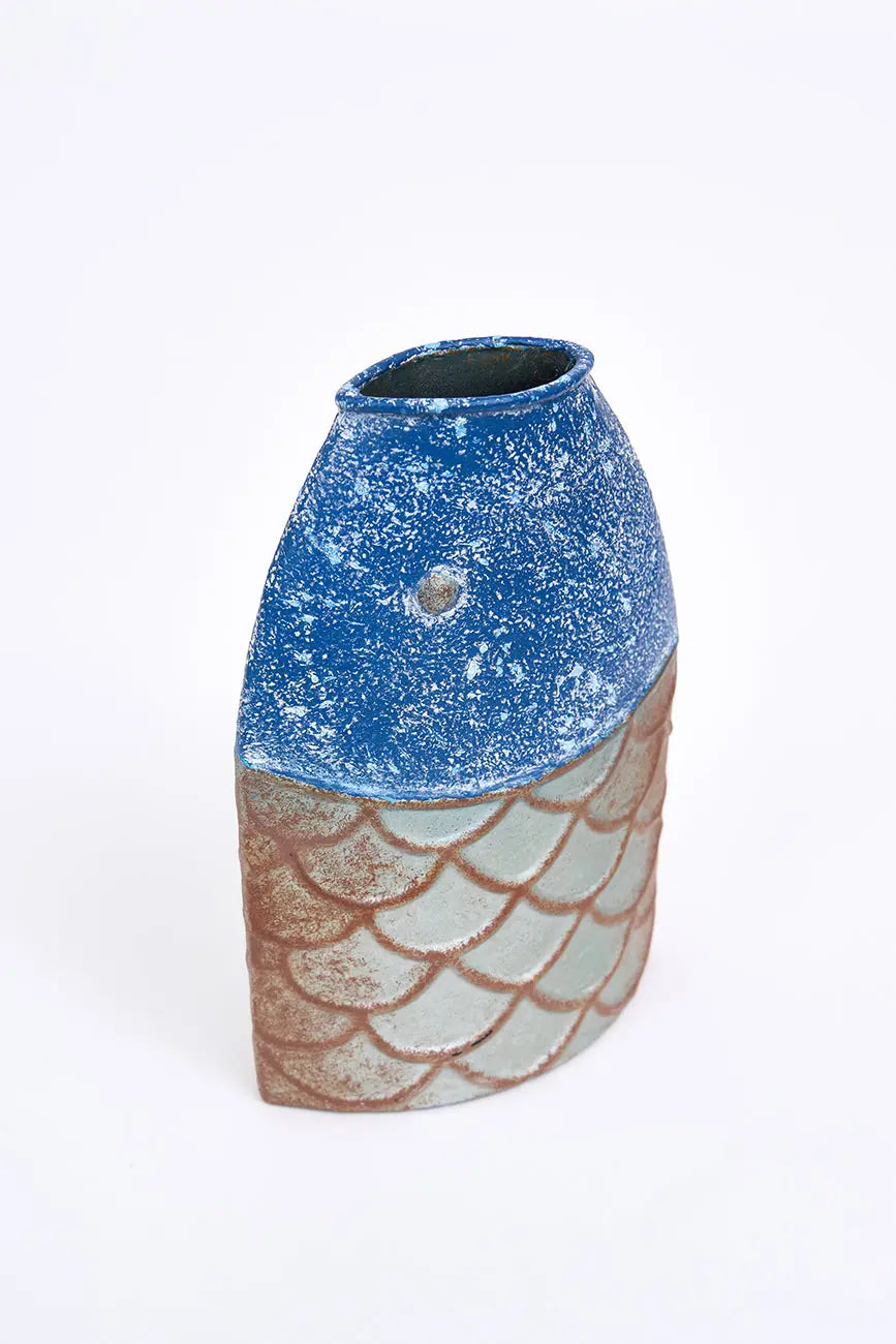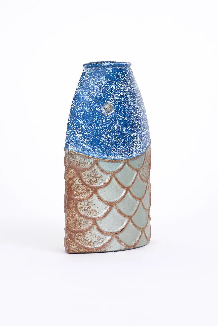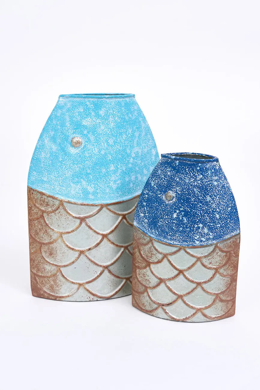 Florero hecho en hojalata con forma de pez este original florero de hojalata, diseñado con forma de pez, combina funcionalidad y creatividad para aportar un toque único a tu decoración.ideal para llenar de frescura y estilo cualquier espacio. Perfecto para flores frescas o secas, es una opción ideal para amantes del diseño marinero y piezas decorativas con carácter. Dimensiones: l: 10 cm – w: 5 cm – h: 15 cm.