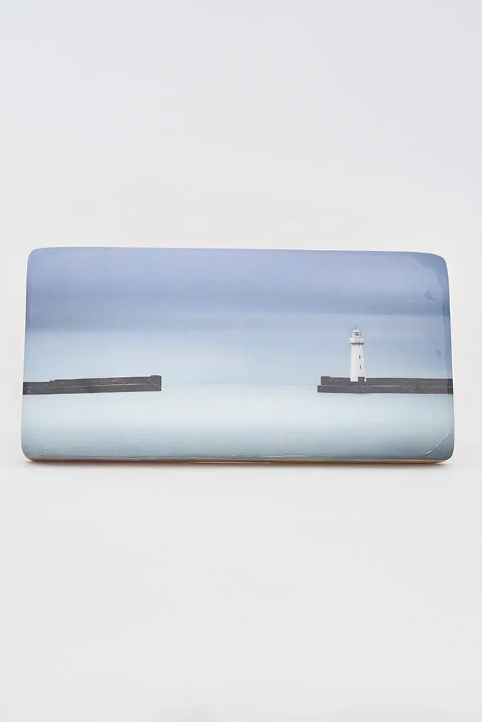 Foto impresa sobre taco de madera: puerto con faro preciosa imagen impresa en taco de madera esmaltada, mostrando un pintoresco puerto con faro blanco. Este encantador accesorio decorativo captura la esencia marítima, aportando un toque nostálgico y sereno a tus paredes. Perfecto para regalo. Dimensiones: l: 40 cm – w: 20 cm – h: 3 cm.