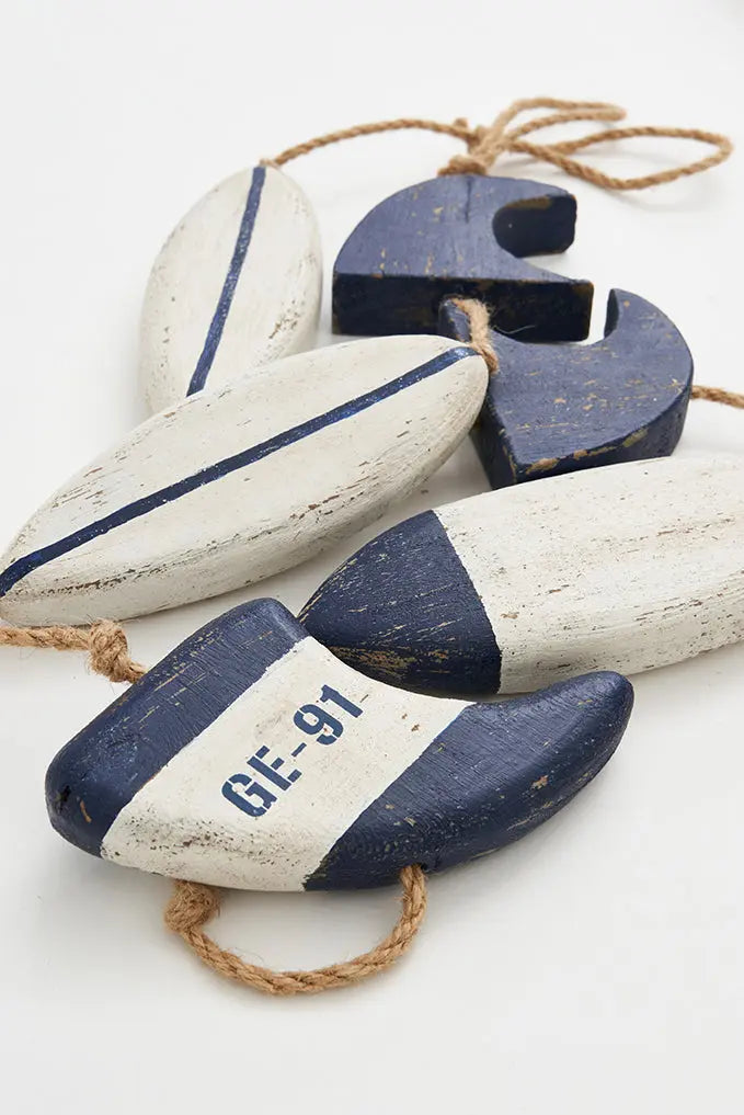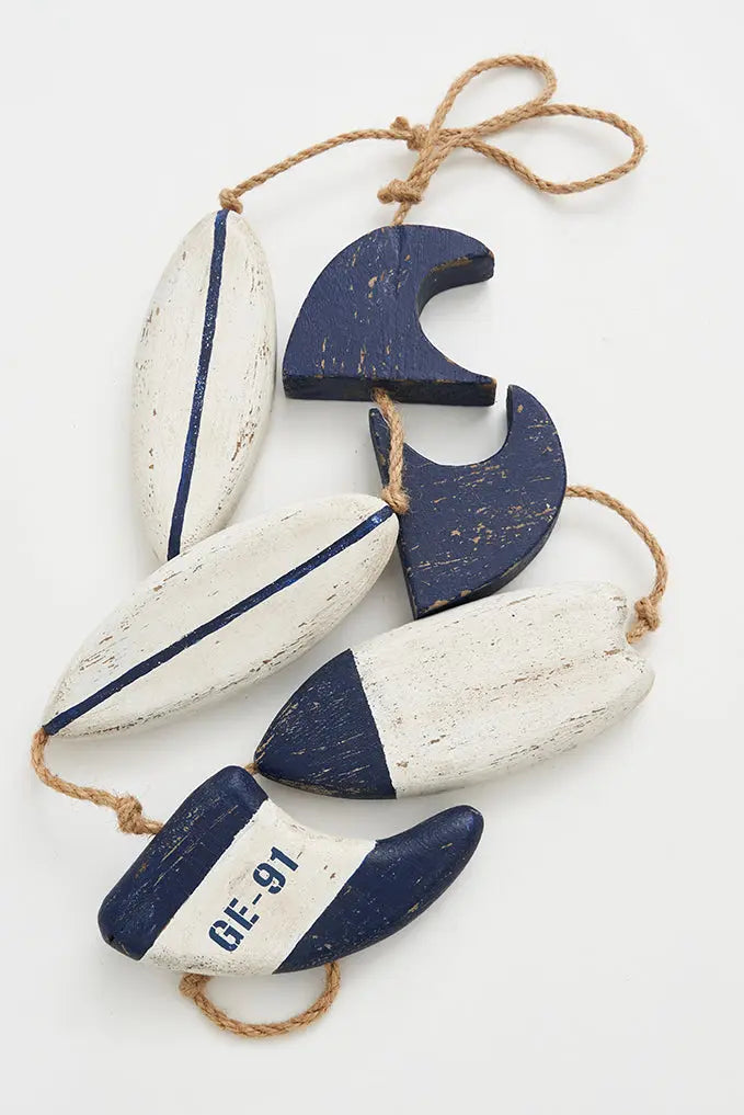 Guirnalda tablas de surf de madera: decoración playera y náutica dale un toque veraniego y relajado a tu espacio con nuestra guirnalda de tablas de surf de madera. Colgadas con estilo, estas tablas aportarán un ambiente playero a cualquier lugar donde decidas colgarlas. Crea una decoración única y vibrante que captura la esencia de la playa y las olas. Dimensiones: h: 125 cm.