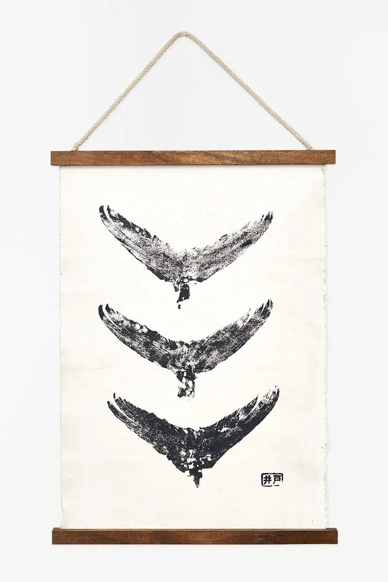 Lámina de tela y madera para colgar con dibujo de colas de atún estilo japonés. 53 x 73 cm. Dimensiones: l: 53 cm – h: 73 cm.