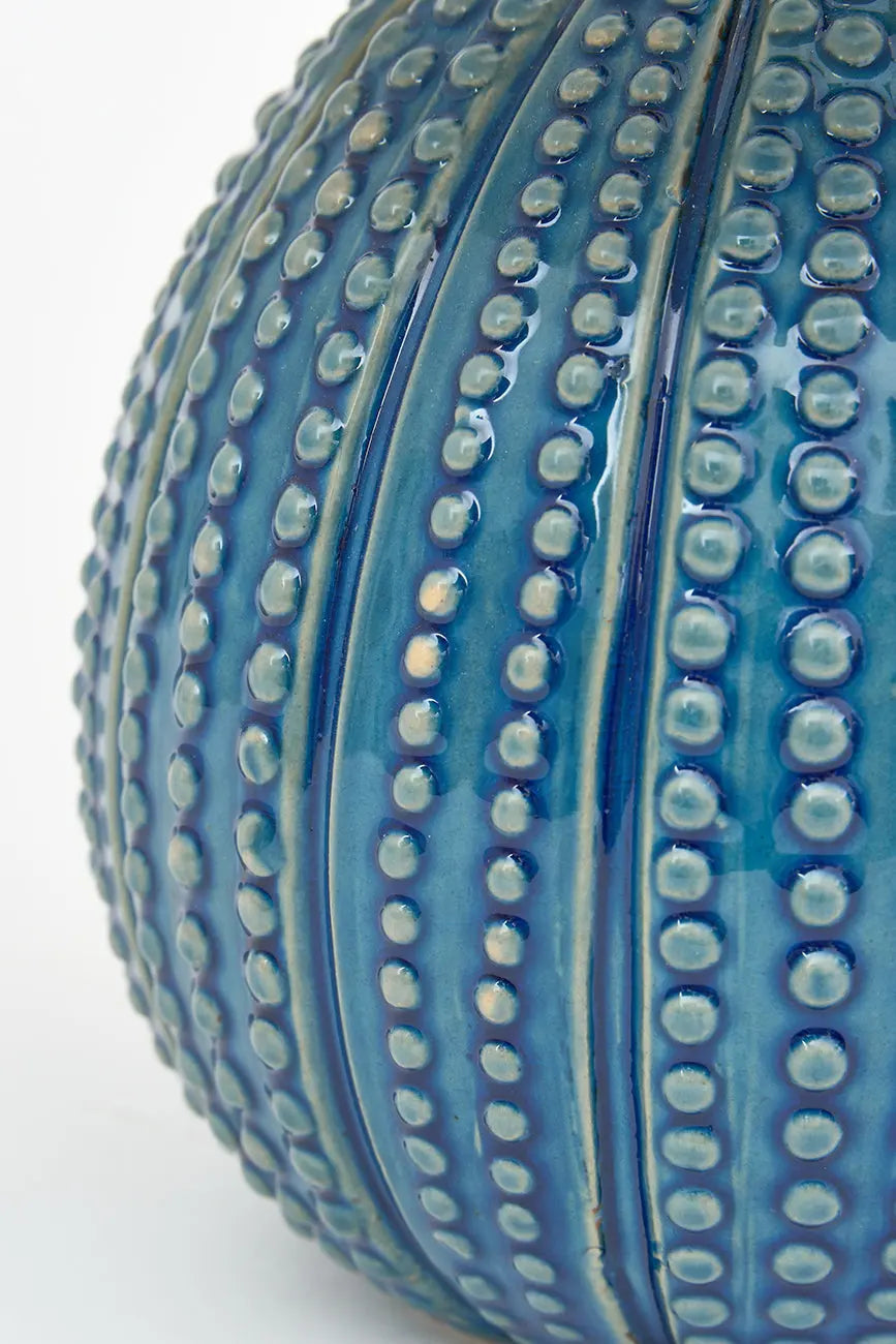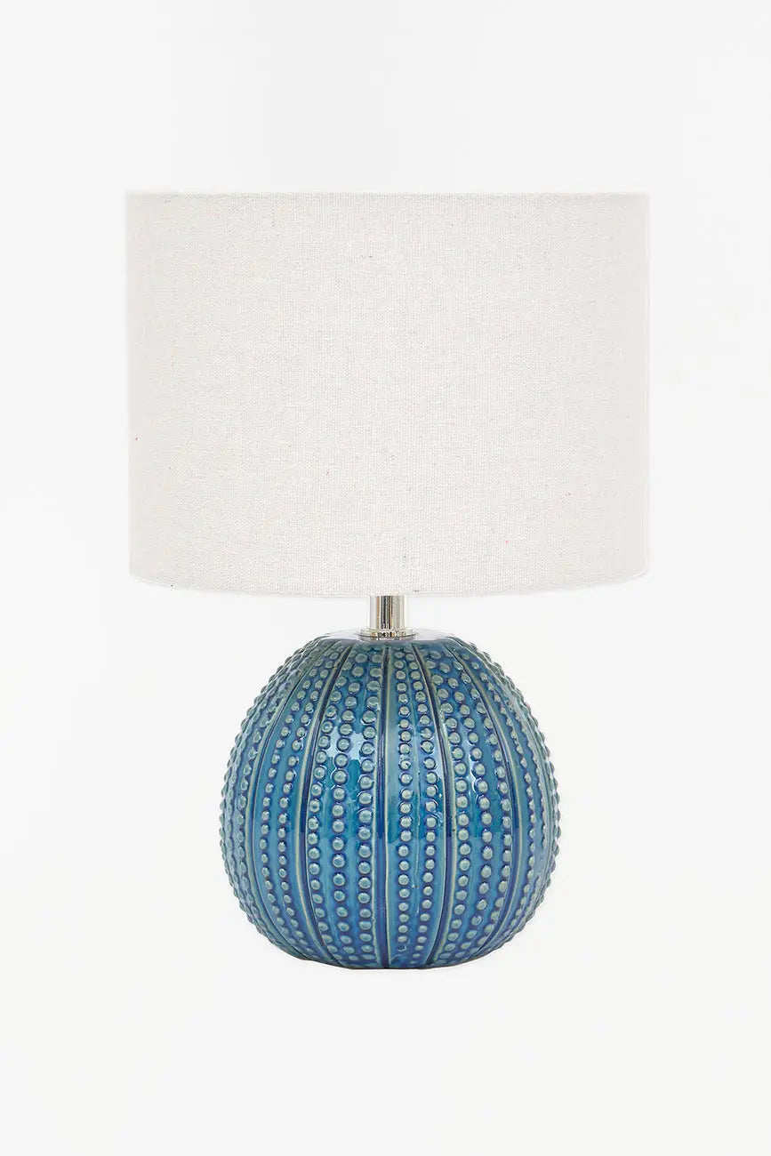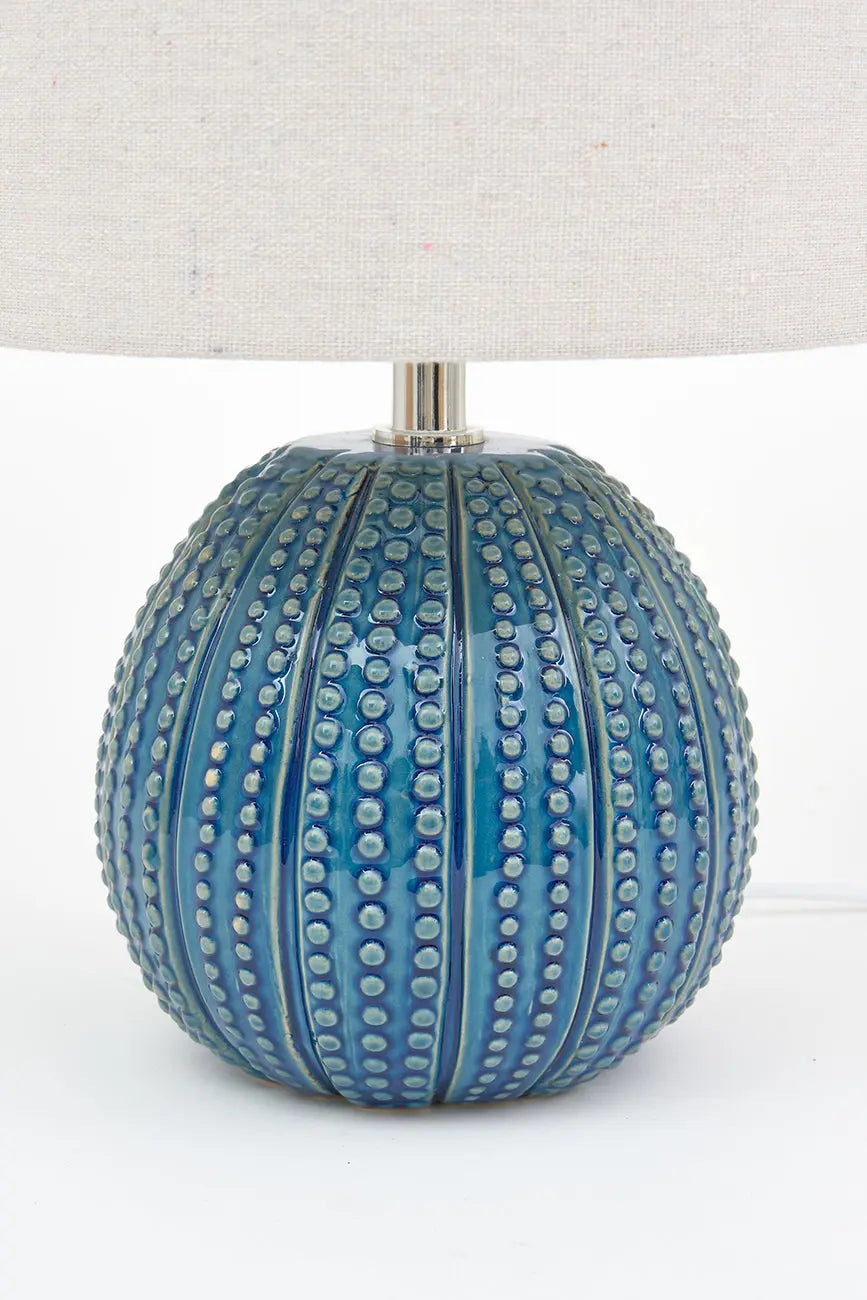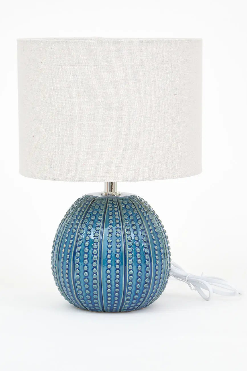 Lámpara decorativa con base de cerámica diseñada en forma de erizo de mar, perfecta para aportar un toque marinero y elegante a cualquier estancia. Su pantalla de canvas de alta calidad proporciona una iluminación suave y cálida, ideal para crear ambientes acogedores. Dimensiones: h: 33 cm – ø: 22,5 cm.