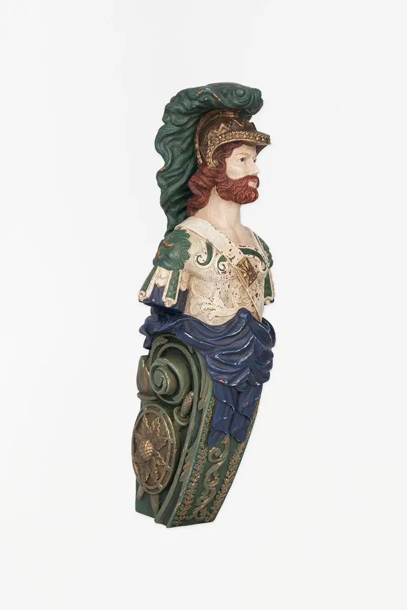 Mascarón hecho de resina. Toma la imagen de un personaje mitológico, cuyo valor es exaltado en la ilíada de homero. El barco que portó este mascarón, tuvo un papel importante en las guerras napoleónicas. Dimensiones: h: 35 cm.