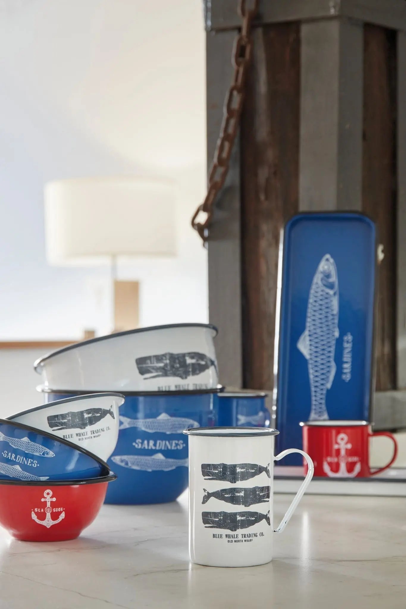 Taza de metal esmaltado en color azul. Lleva dos sardinas pintadas en color blanco con el texto ‘sardines’. Tamaño medio. Dimensiones: h: 8 cm – ø: 8 cm.