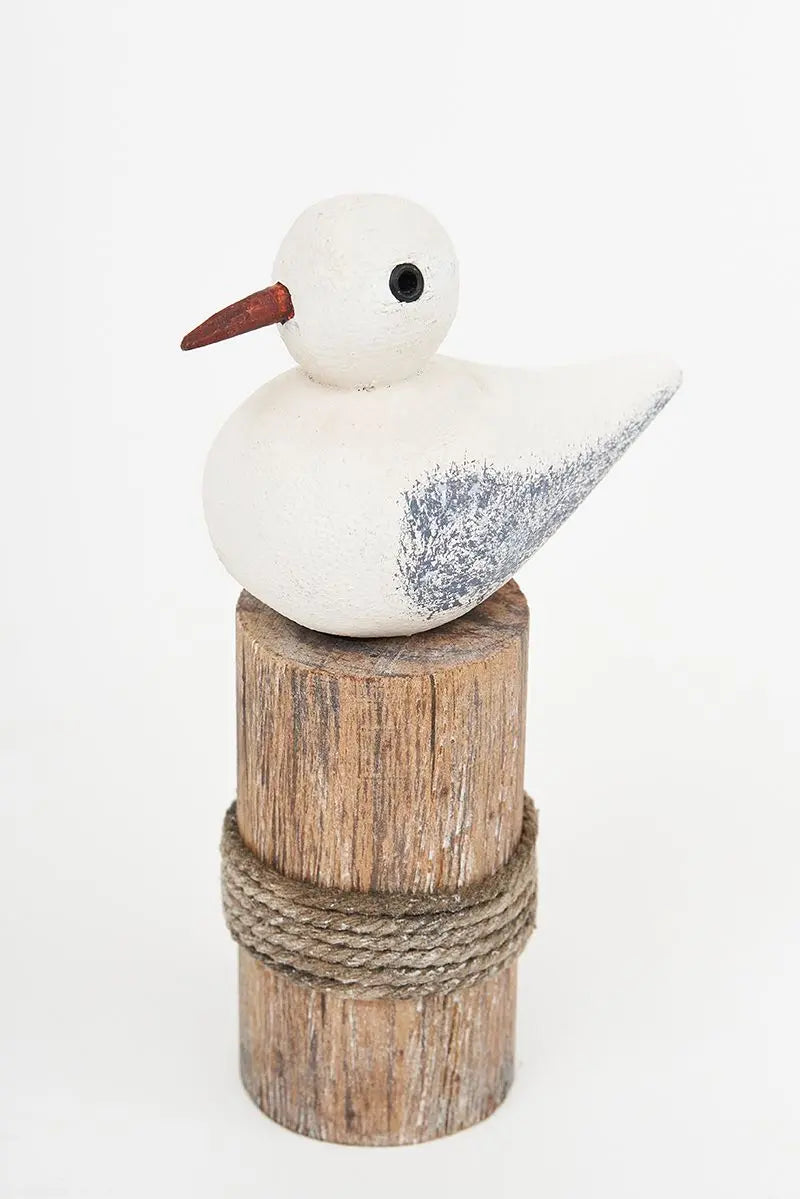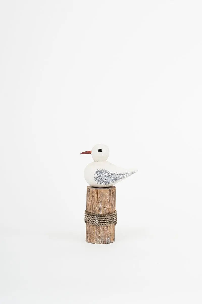 Figura de pájaro fabricada en madera, con base de muelle que le aporta movimiento y un toque divertido. Pintado en tonos blanco y gris, destaca por su diseño simpático y su aire marinero. Ideal para estanterías, escritorios o espacios decorativos con estilo náutico desenfadado. Dimensiones: l: 6,7 cm – h: 11,5 cm.