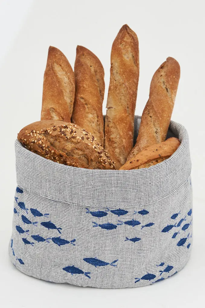 Panera en chambray gris “banco de peces azules”: toque marino en tu mesa. Esta elegante panera, hecha de chambray gris (hilo de algodón tipo denim), con un diseño de banco de peces azules, aporta un estilo náutico y contemporáneo a tu mesa. Perfecta para mantener el pan fresco y como un atractivo elemento de decoración marinera en tu comedor. Combina la funcionalidad con un diseño moderno y un toque del océano. Dimensiones: l: 20 cm – h: 18 cm.