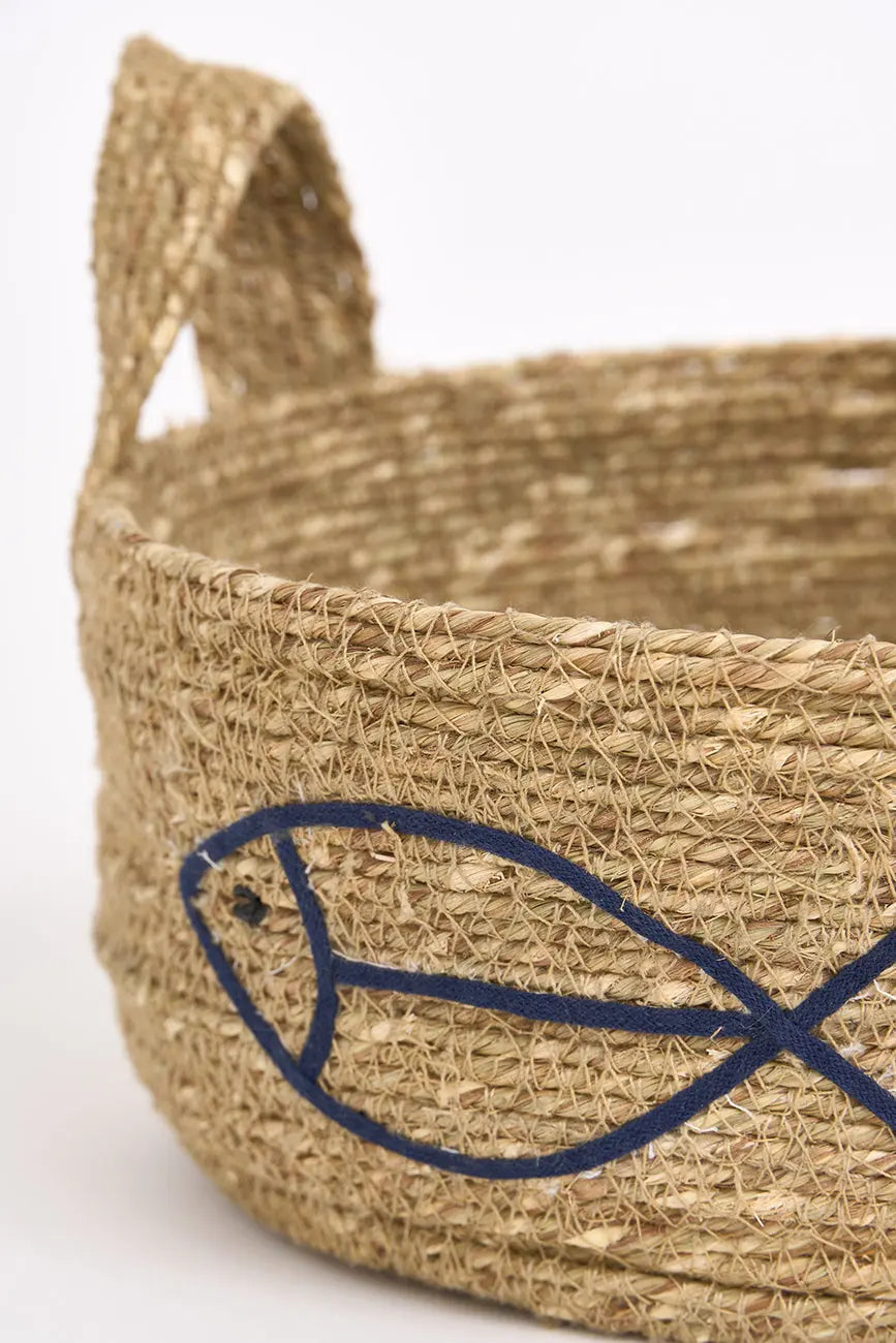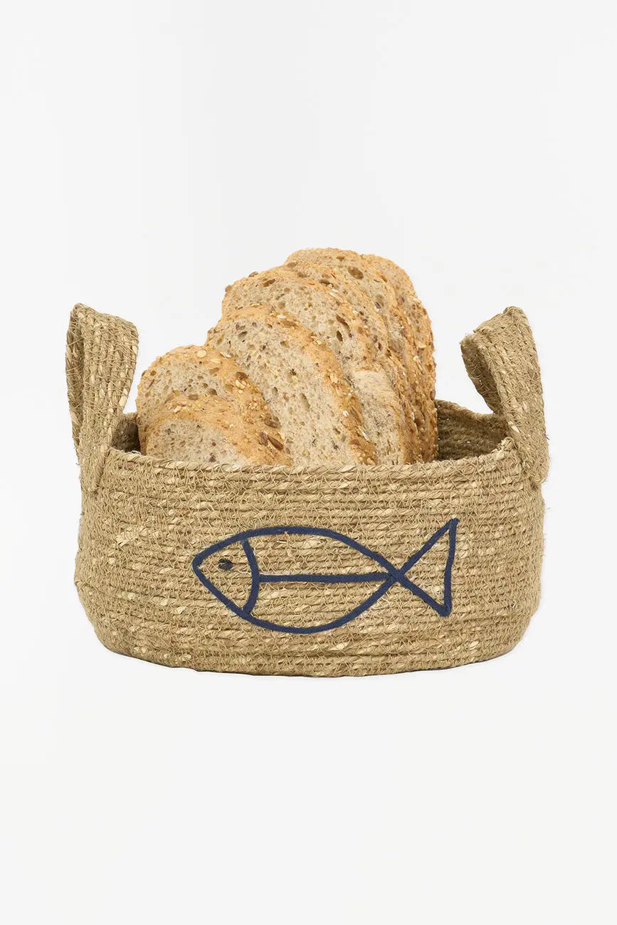 Panera de yute con una figura de pez esta panera de yute, adornada con una encantadora figura de pez, es el complemento perfecto para aportar un toque rústico y marinero a tu mesa. Fabricada con materiales naturales y resistentes, su diseño artesanal permite mantener el pan fresco con estilo. Ideal para el uso diario o como elemento decorativo en cocinas de inspiración costera. Dimensiones: h: 13 cm – ø: 18 cm.