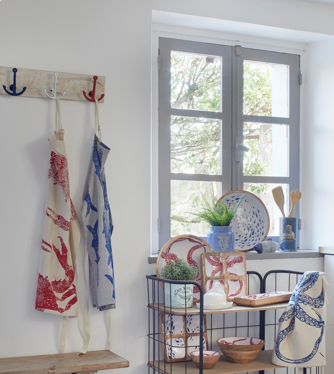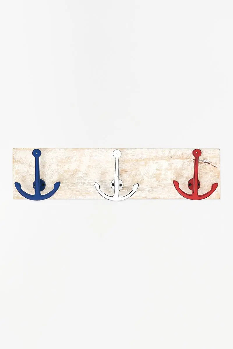 Bonito perchero triple de anclas en tres colores y colocadas en soporte de madera pintado en blanco. Un toque de color que no pasará desapercibido. Dimensiones: l: 50 cm – h: 12 cm.