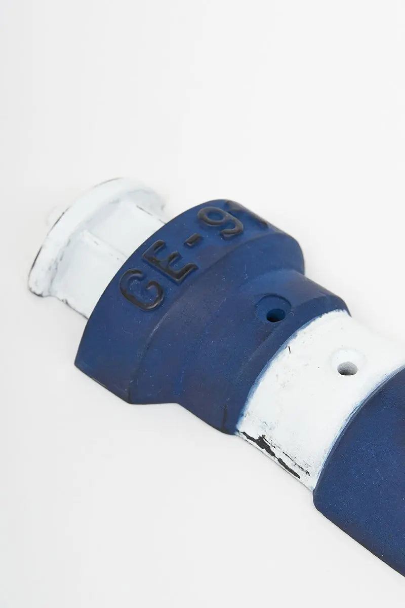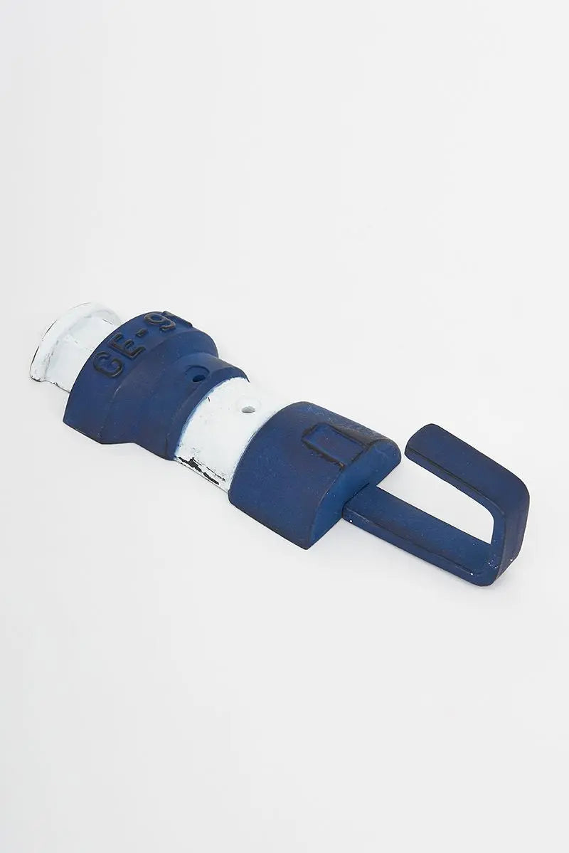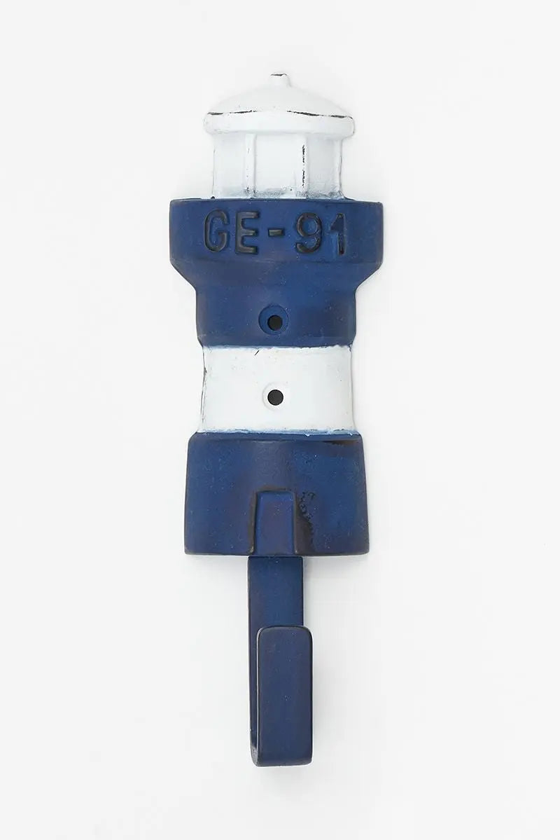 Perchero de metal individual con forma de faro. Esta pintado a rayas azules y blancas. Dimensiones: l: 6,5 cm – h: 20 cm.
