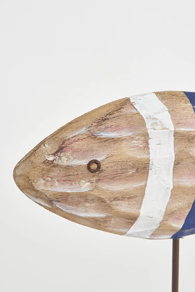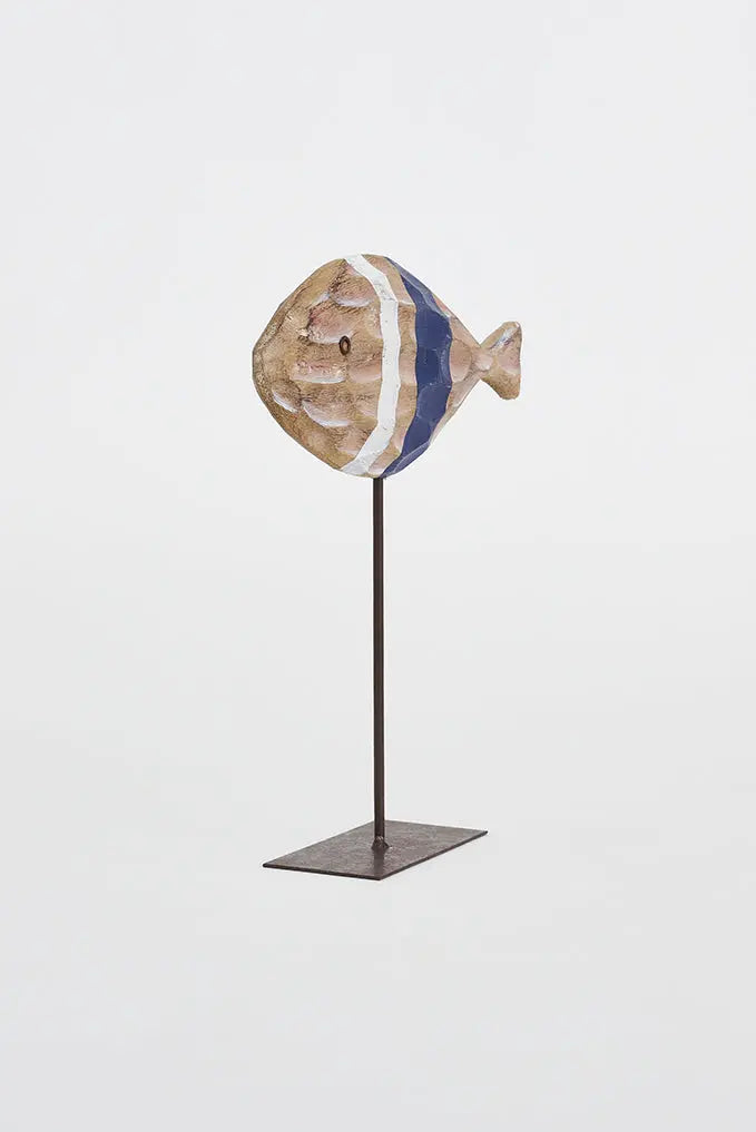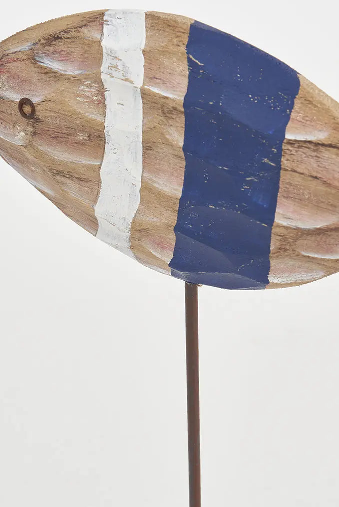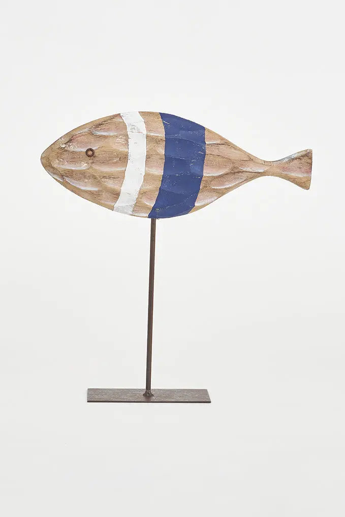 Pez pequeño de madera tallado con escamas y base de metal: elegancia artesanal descubre la elegancia artesanal con nuestro pez de madera, tallado con meticulosidad para crear detalladas escamas, y apoyado sobre una sólida base de metal. Este artículo no solo aporta encanto con estilo náutico, sino que también destaca por su cuidado diseño. Ideal como regalo. Hermano mayor: d7633. Dimensiones: l: 26,5 cm – h: 28 cm.