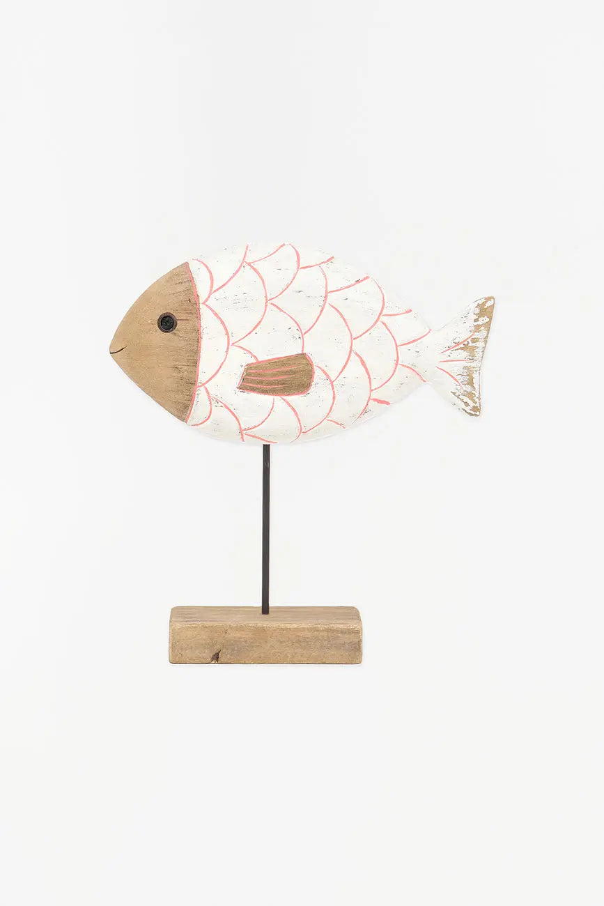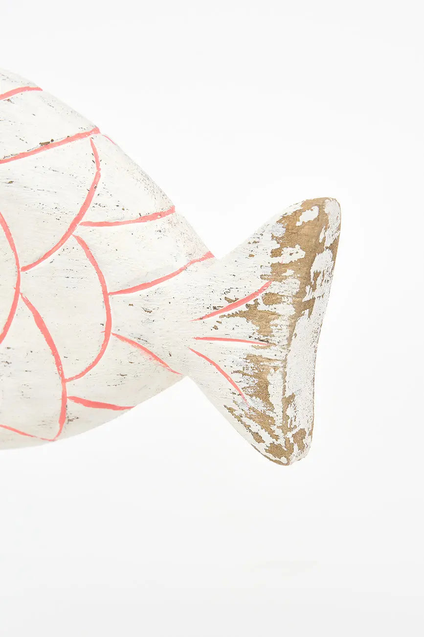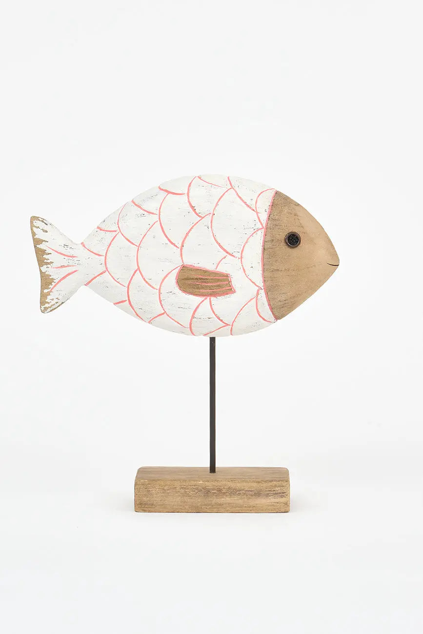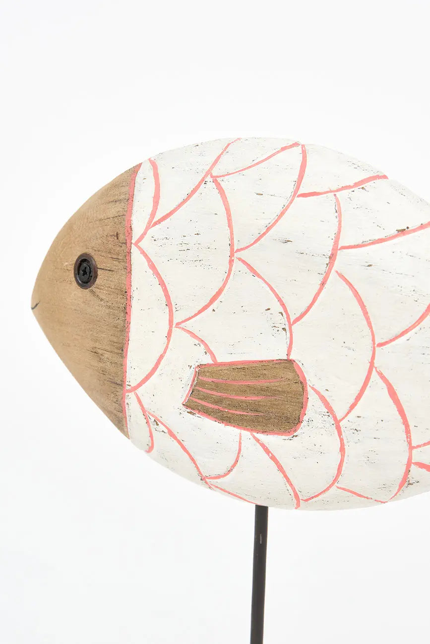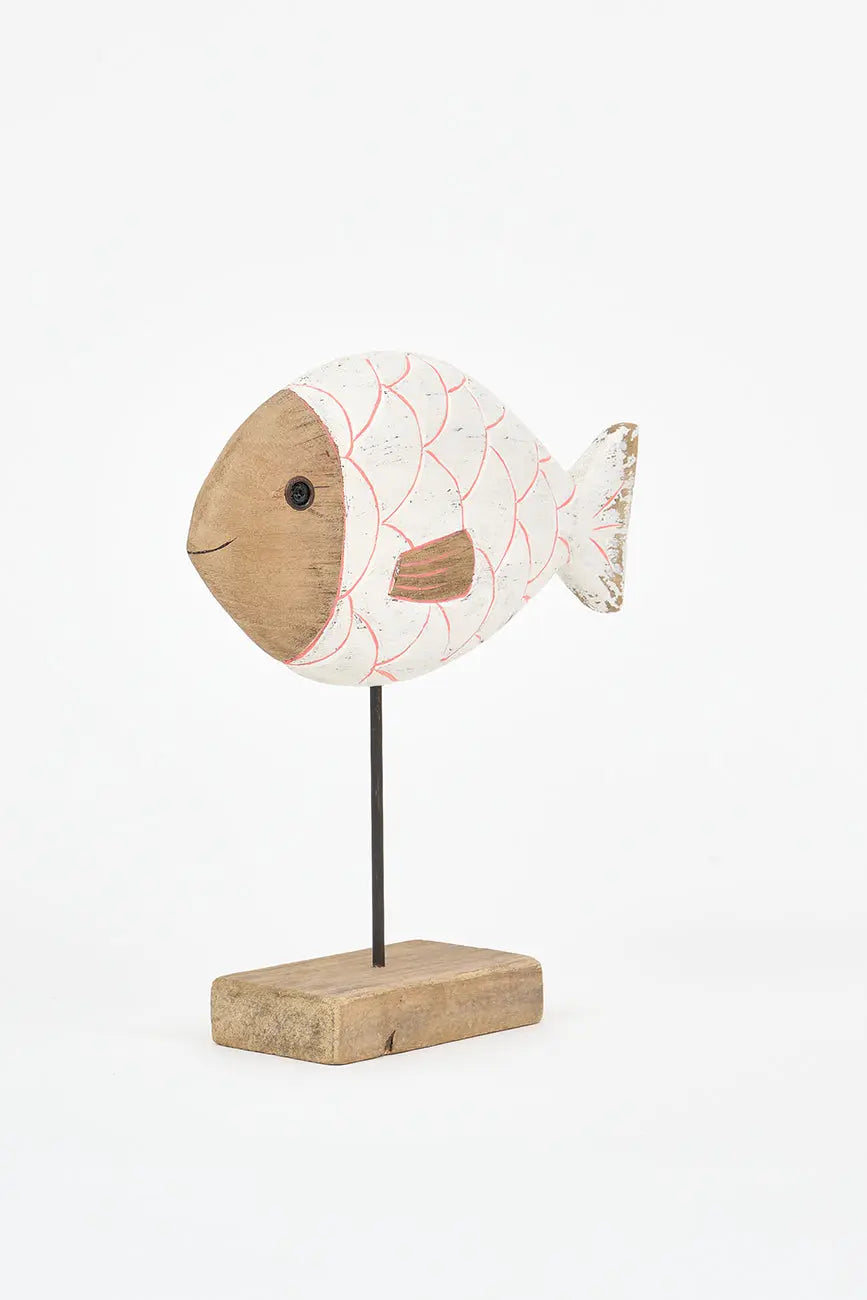 Pez de madera en color turquesa con base. Este pez de madera, pintado en blanco, evoca la frescura del mar y aporta un toque costero a cualquier espacio. Montado sobre una base estable, su diseño detallado y textura natural lo convierten en una pieza decorativa ideal para estanterías, mesas o escritorios. Dimensiones: l: 24 cm – w: 6,5 cm – h: 28 cm.