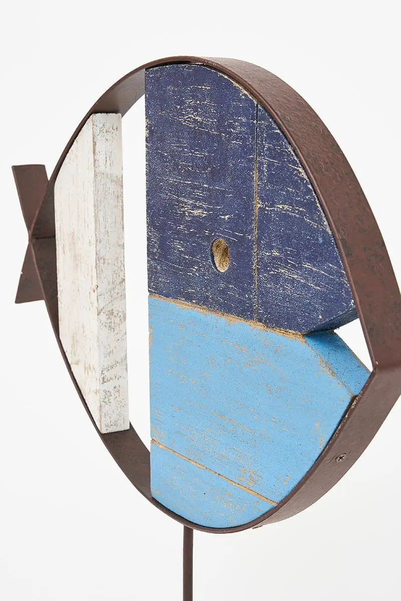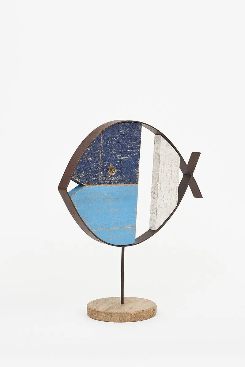 Pez de madera y metal con base de madera. Las partes de madera combinan azul marino, azul cielo y blanco. Dimensiones: l: 38 cm – h: 39,5 cm.