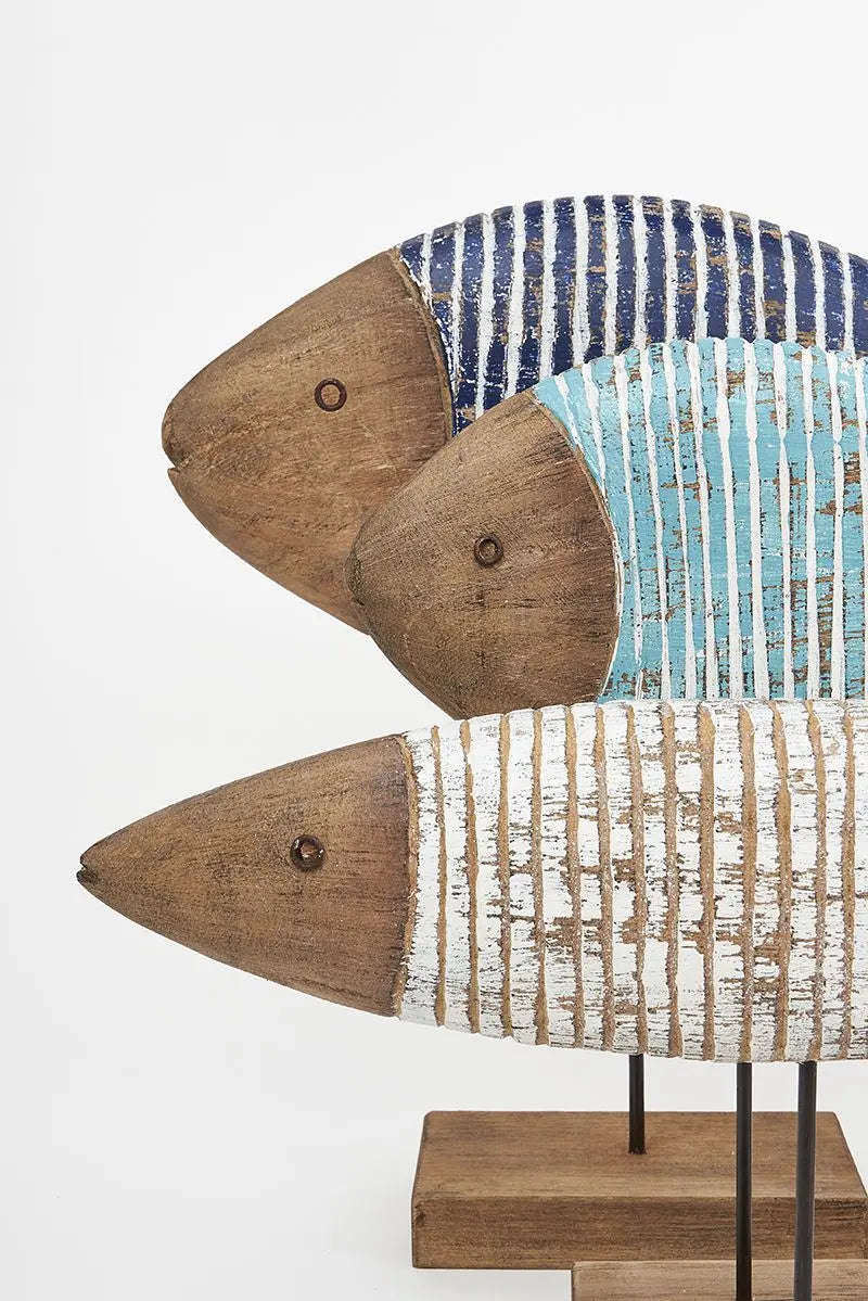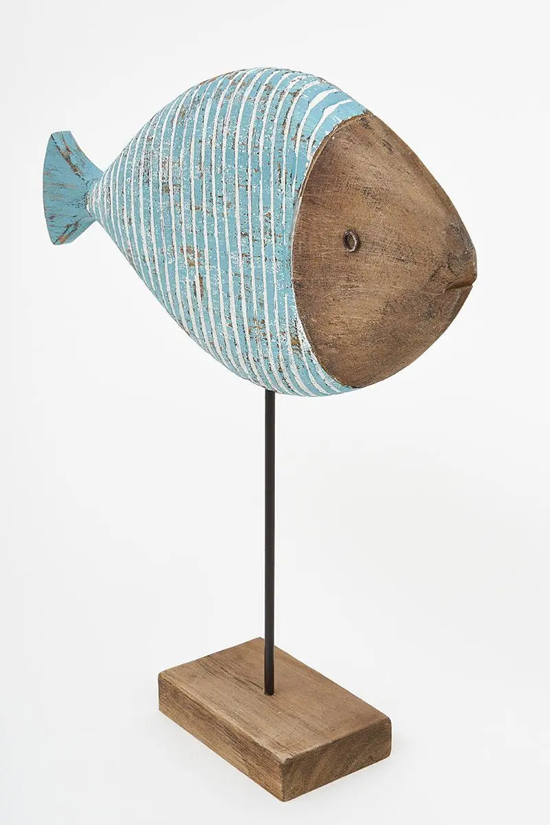 Pez de madera de color turquesa. Está pintada de forma envejecida, detalle que aumenta su esencia marinera. Dimensiones: l: 32 cm – h: 36,5 cm.