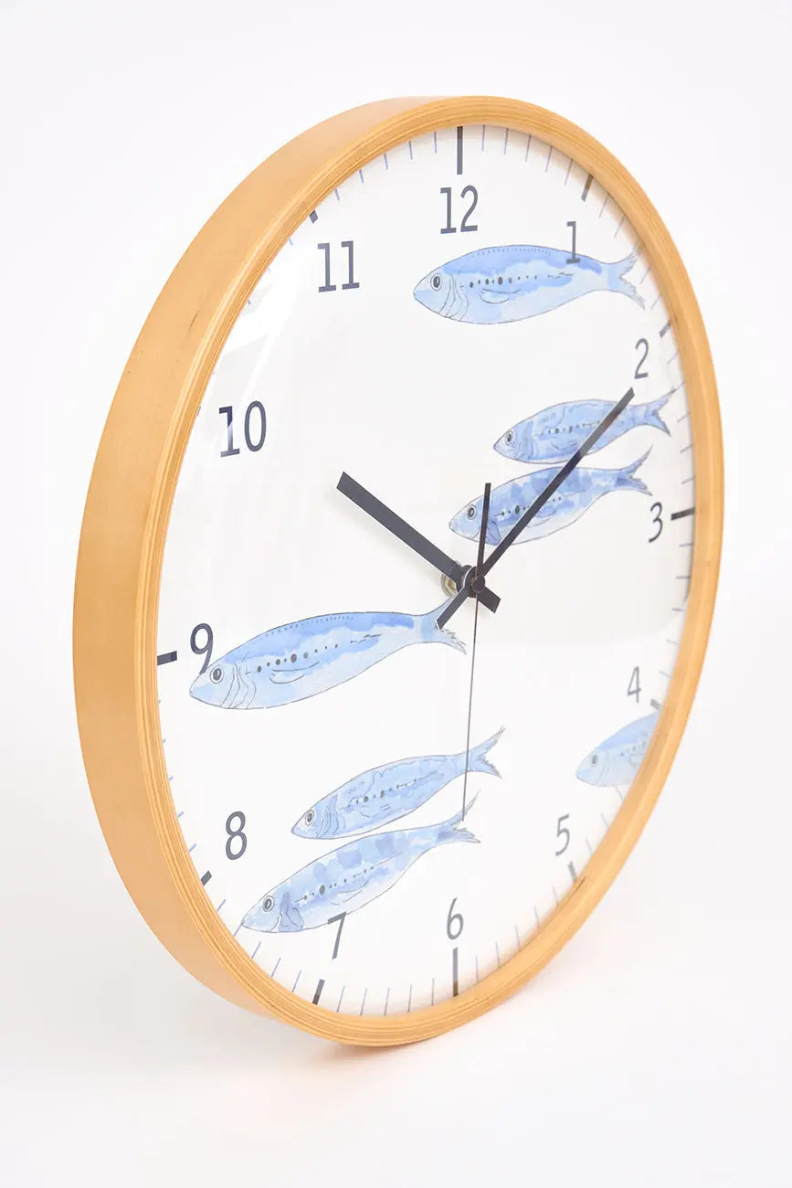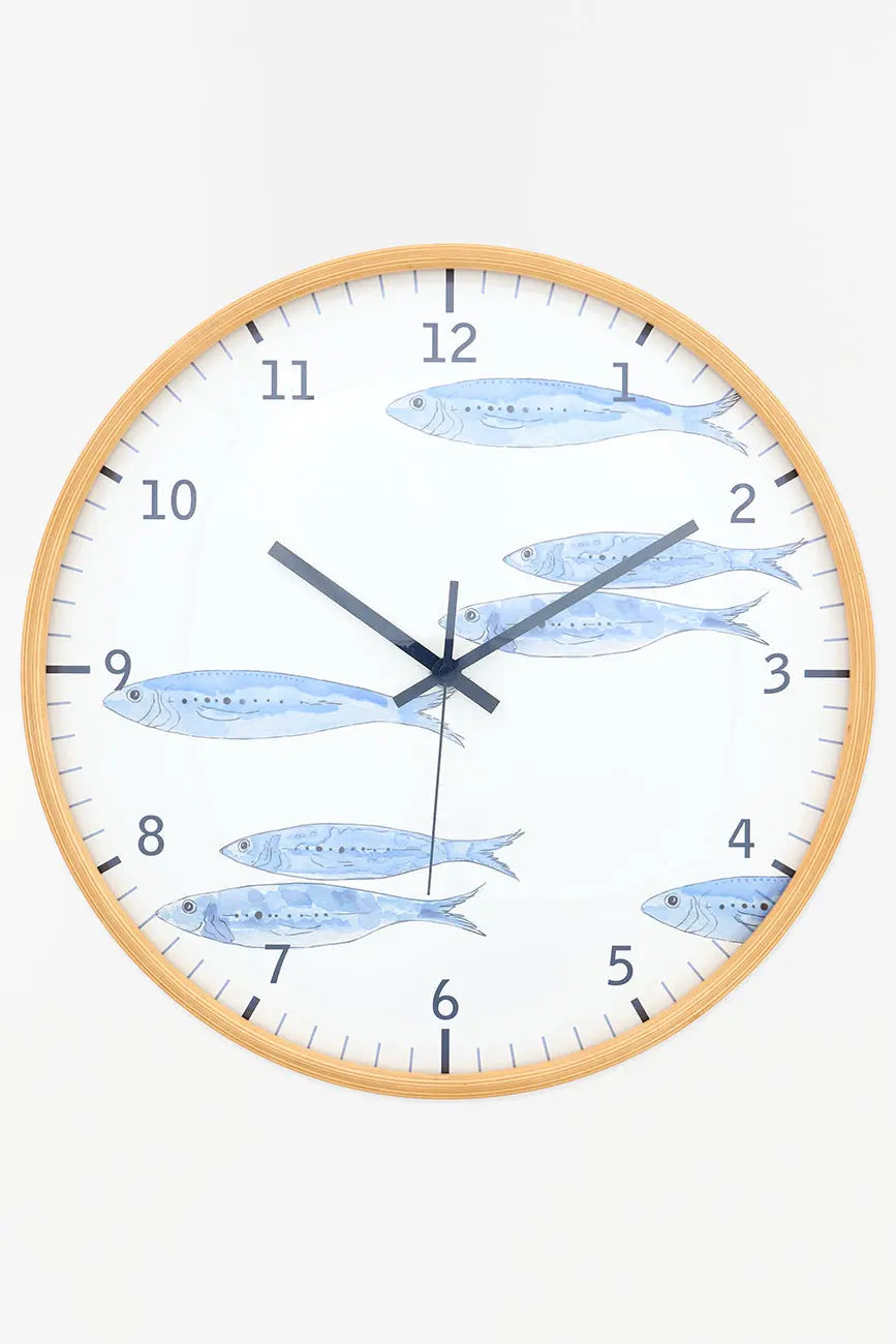Reloj de pared con esfera decorada con varios peces pintados, ideal para aportar un toque divertido y marino a tu decoración. Perfecto para cualquier habitación que desee evocar el océano. Dimensiones: ø: 35 cm.