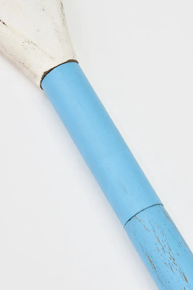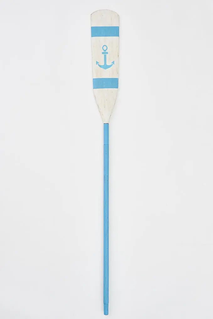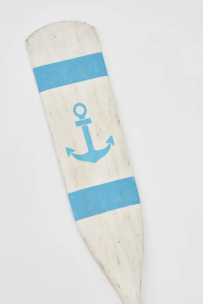 Remo de madera vintage. Este remo, pintado en tonos turquesas y blancos con un toque envejecido, presenta un ancla en la pala. Con su diseño marinero, es el accesorio perfecto para añadir un toque náutico a tu hogar. Colócalo en tu pared para evocar la serenidad del mar y dar un toque original a tu decoración. Dimensiones: l: 145 cm.