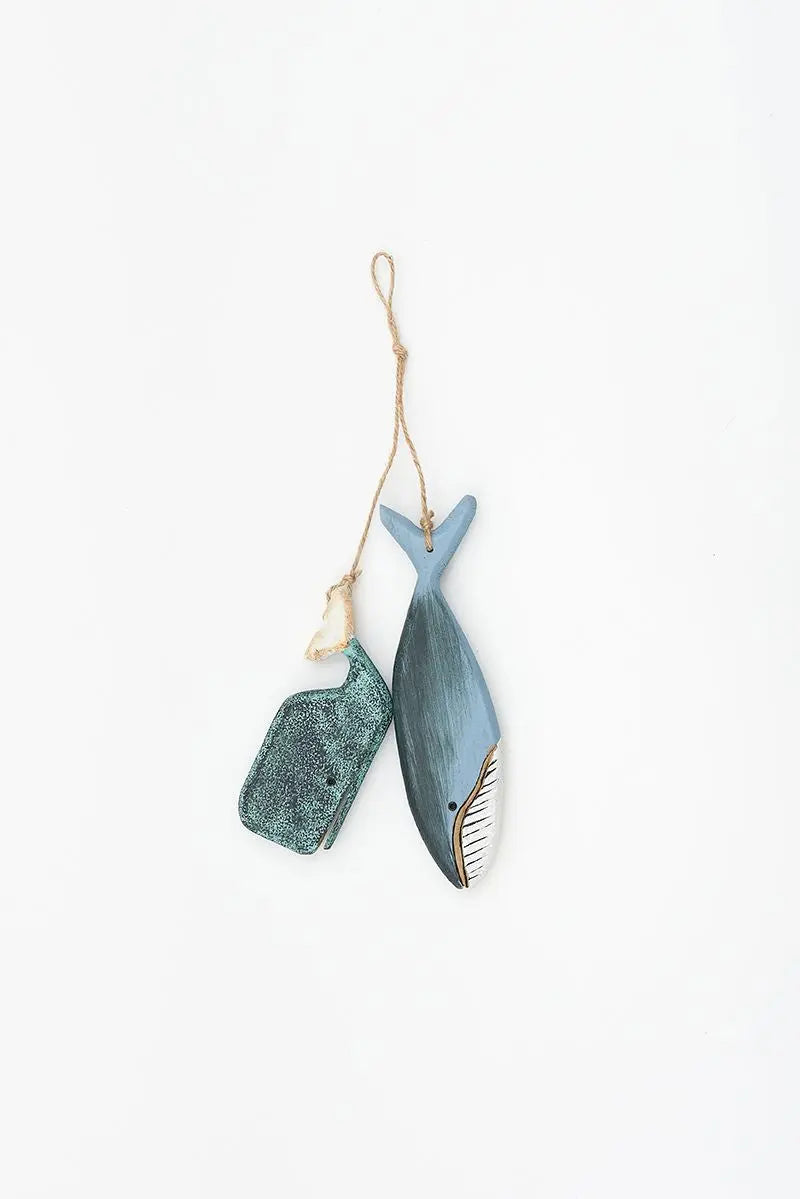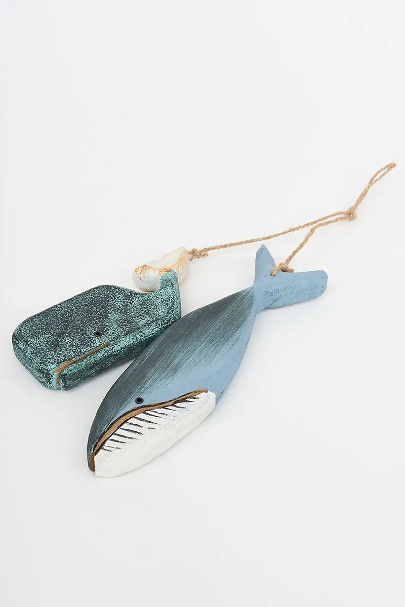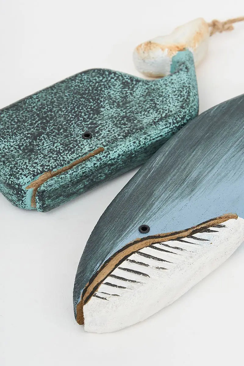 Ristra de 2 ballenas de madera azul cielo y turquesa. Tienen una terminación envejecida que aumenta su toque marinero. Dimensiones: h: 20 cm.